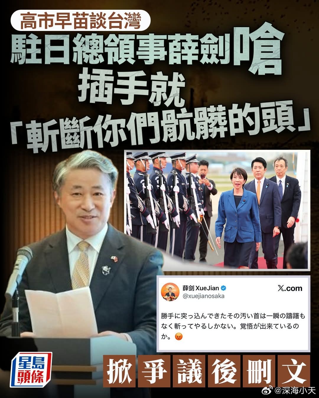 中国驻大阪总领事薛剑于8日晚在X转发相关日媒报道,并发文写说:「那种擅自闯入的肮脏头颅,就应该毫不犹豫斩掉。你们意识到了吗?」