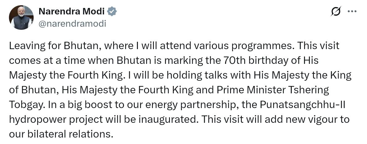 莫迪:我即将启程前往不丹,出席多项活动。此次访问正值不丹庆祝第四世国王陛下70岁寿辰之际。我将与不丹国王陛下、第四世国王陛下以及首相策林·托杰举行会谈。为大力推进我们的能源合作,普纳藏曲二期水电站项目将正式启用。此次访问必将为我们的双边关系注入新的活力。