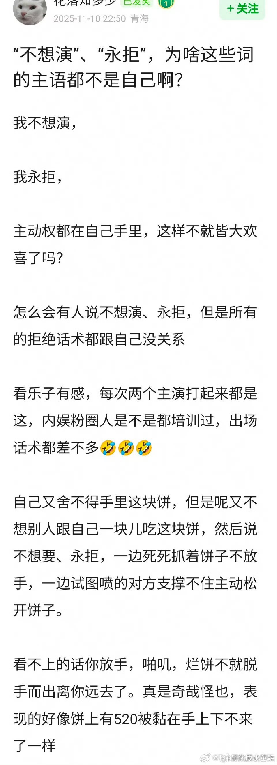 为什么永拒别人而不是自己正主,因为艺人本人舍不得拒饼,现在脂粉遍布的内娱,粉丝做什么事都是艺人本人教的,不想合作谁就让粉丝去永拒谁,然后自己躲在背后装白莲花,完全不像个男人![允悲]