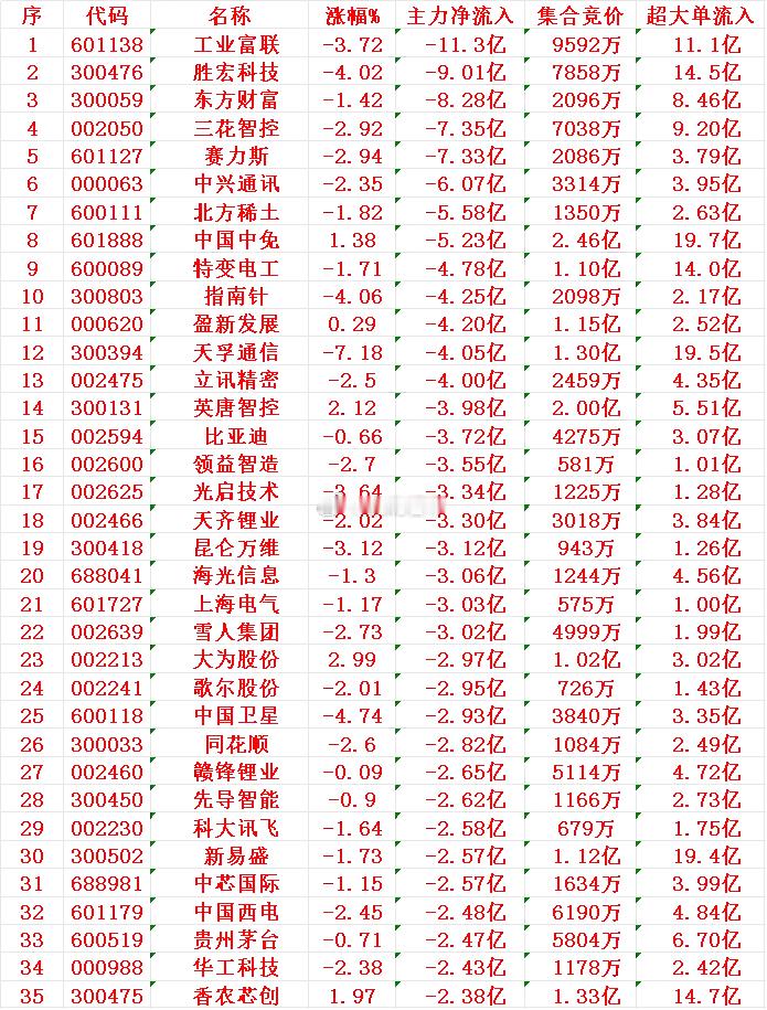 1月11日中午收盘,主力资金“大幅卖出”的35名单: