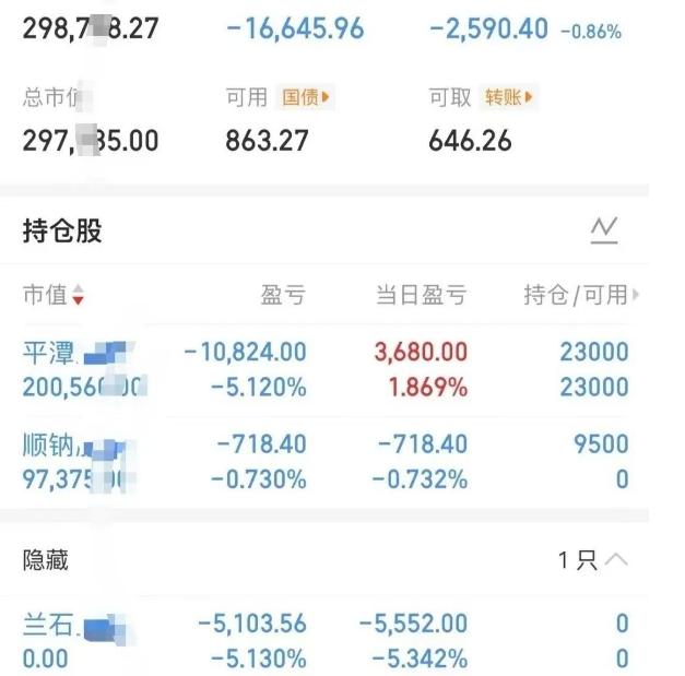 大曾子又跌破30万了,平潭依然格局,昨天赚钱没卖还加仓,但昨天就被合富卡位了,今天合服反包,平潭也没跌停,目前还是红的,大曾子昨天买了兰石,今天低开低走,他割了又去了点顺钠,不过大仓位都在平潭,目前还亏5个点,但资金好像已经放弃了平潭,合富主要是名字好听,和去年的日出东方一样,到底能走多远,谁也不好说。 网友都怀疑,大曾子是不是实盘,天天这么亏,难道不心疼吗
