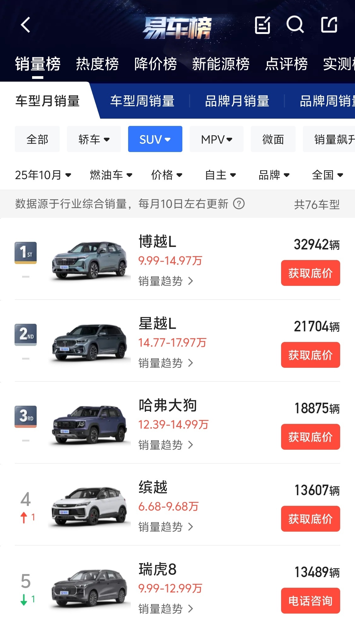 过去十年来,我一直认为吉利是自主品牌设计的门面,从博字辈到缤字辈再到星字辈,市场认可度都很高。10月的自主品牌燃油SUV销量榜,前五名就有三辆吉利,确实是不错的选择[并不简单][并不简单]