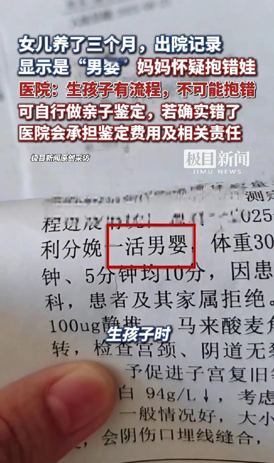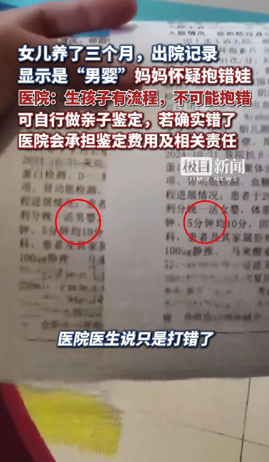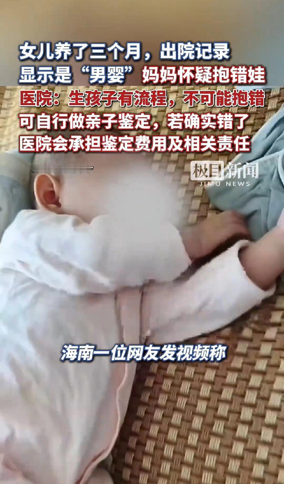 海南,一位妈妈在医院生下一个女儿,回家后,女儿养了三个月,却突然发现出院记录上显示的是“男婴”。一瞬间,妈妈怀疑自己是不是抱错了娃,找到医院问情况,医院回应:生孩子有流程,不可能抱错。 (来源:极目新闻) 事情要从三个月前说起,这位妈妈在海南医科大学第一附属医院顺利生下了一个女儿,粉雕玉琢的小模样,让全家都把她当成了掌上明珠。 接下来的三个月里,换尿布、喂奶粉、哄睡,妈妈每天围着孩子转,看着女儿从皱巴巴的小不点长成会咯咯笑的小可爱,心里满是幸福。 可就在11月9号这天,一次偶然的翻找彻底打破了这份平静。 妈妈想整理一下生孩子时的相关单据,翻出出院记录一看,上面赫然写着“分娩一活男婴”。 这几个字像晴天霹雳,让她瞬间懵了:自己明明生的是女儿,养了整整三个月的也是个小姑娘,怎么出院记录会是“男婴”? 她越想越害怕,脑子里忍不住冒出最坏的念头:难道孩子在医院被抱错了?这三个月的朝夕相处,难道是一场乌龙? 带着满心的焦虑,她赶紧把这段经历拍成视频发到网上,希望能得到网友的建议,也想让医院给个说法。 第二天上午,她联系了医院,可医生只轻描淡写地说“只是打错了,改一下就好”,没给更多解释。 记者随后联系医院时,工作人员也坚称“生孩子有相应流程,不可能抱错”,还表示如果家长不放心,可以自行做亲子鉴定,真有错的话医院会承担费用和责任。 好在11月10号晚上,医院的正式通报来了:经核查分娩记录、护理记录和监控,妈妈分娩期间只有一名婴儿出生,孩子确实是女婴,出院记录上的性别是记录人员笔误,而且早在8月20号就已经更正了,只是没及时跟家长沟通清楚。 这场虚惊一场的风波,不少网友感同身受。 有人说,换我我也崩溃,性别这么大的事能写错,其他信息能靠谱吗?医院一开始的态度太敷衍了,一句“打错了”根本安抚不了家长的焦虑。 也有网友觉得,只要孩子没抱错就好,笔误难免,医院后续处理还算诚恳。 还有人联想到了之前的错换人生28年案,直言这种事真的不能掉以轻心,一旦出错就是两个家庭的悲剧。 在我看来,这场乌龙虽然最终有惊无险,但不能简单归结为“笔误”。 医院的初始回应太缺乏同理心,家长面对“性别写错”的晴天霹雳,需要的是耐心解释和明确查证,而不是冷冰冰的“不可能错”和让家长自行做鉴定的推诿。 其次,出院记录作为重要医疗文书,性别这种关键信息居然会写错,还没及时主动告知家长,暴露的是医院管理上的漏洞和工作人员的疏忽。 不过值得肯定的是,医院后续成立调查组彻查、诚恳致歉并主动承担亲子鉴定费用,算是及时弥补了过错。 希望所有医院在涉及新生儿的每一个环节都精益求精,让家长们不再为这样的“笔误”而提心吊胆,让每个新生命都能在严谨的守护下安心成长。 医护人员多一份细心,流程多一道核对,就能少一次这样的家庭焦虑。