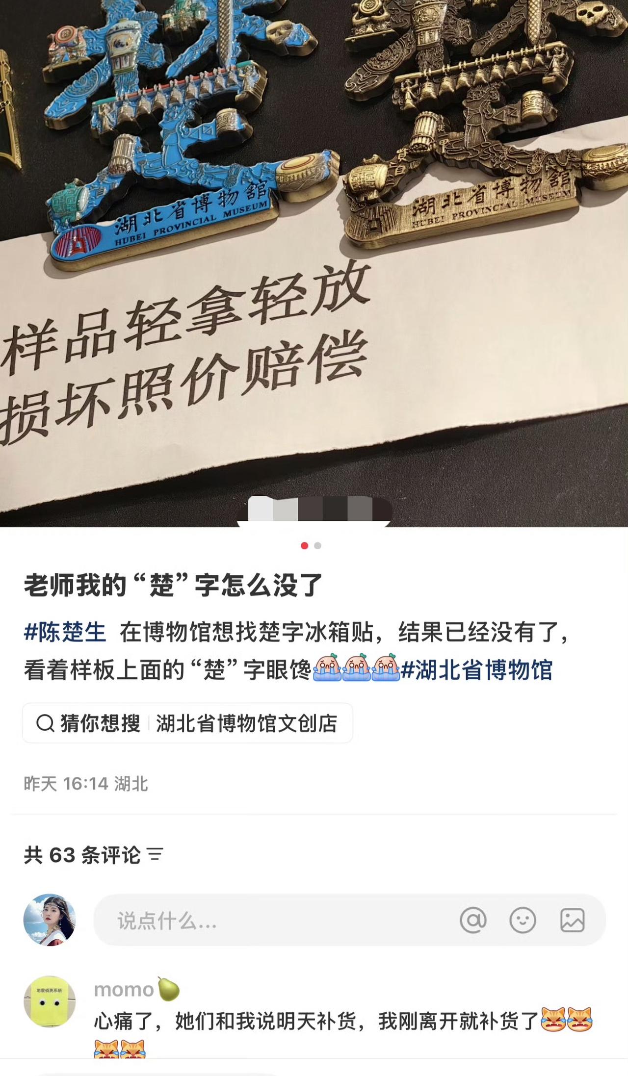 湖北博物馆的“楚”字冰箱贴卖断货! 估计湖北博物馆从来没想过这个冰箱贴会卖断货。 竟然还有网友专门去求购。 就是因为生哥开了场演唱会,仅是因为它是陈楚生的“楚”!这也太疯狂了吧。