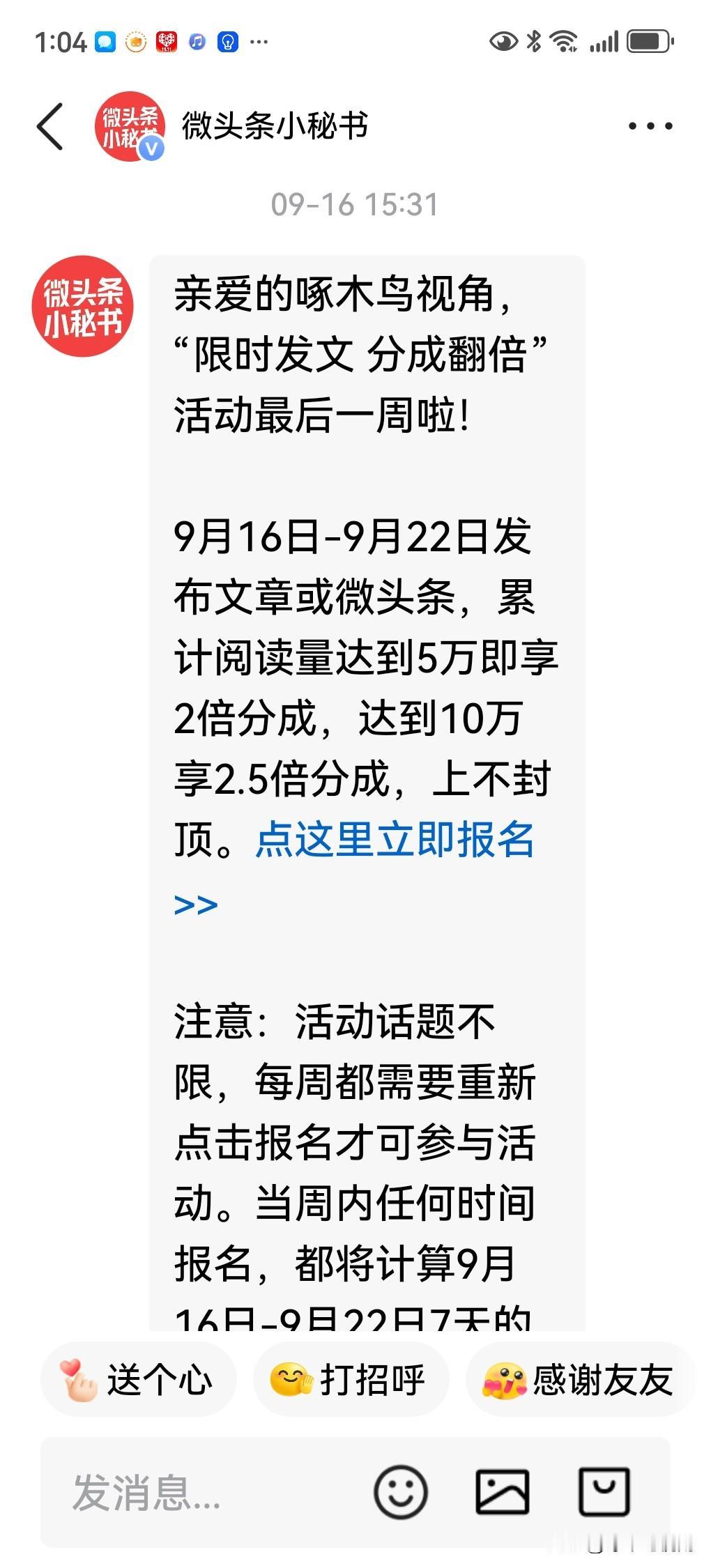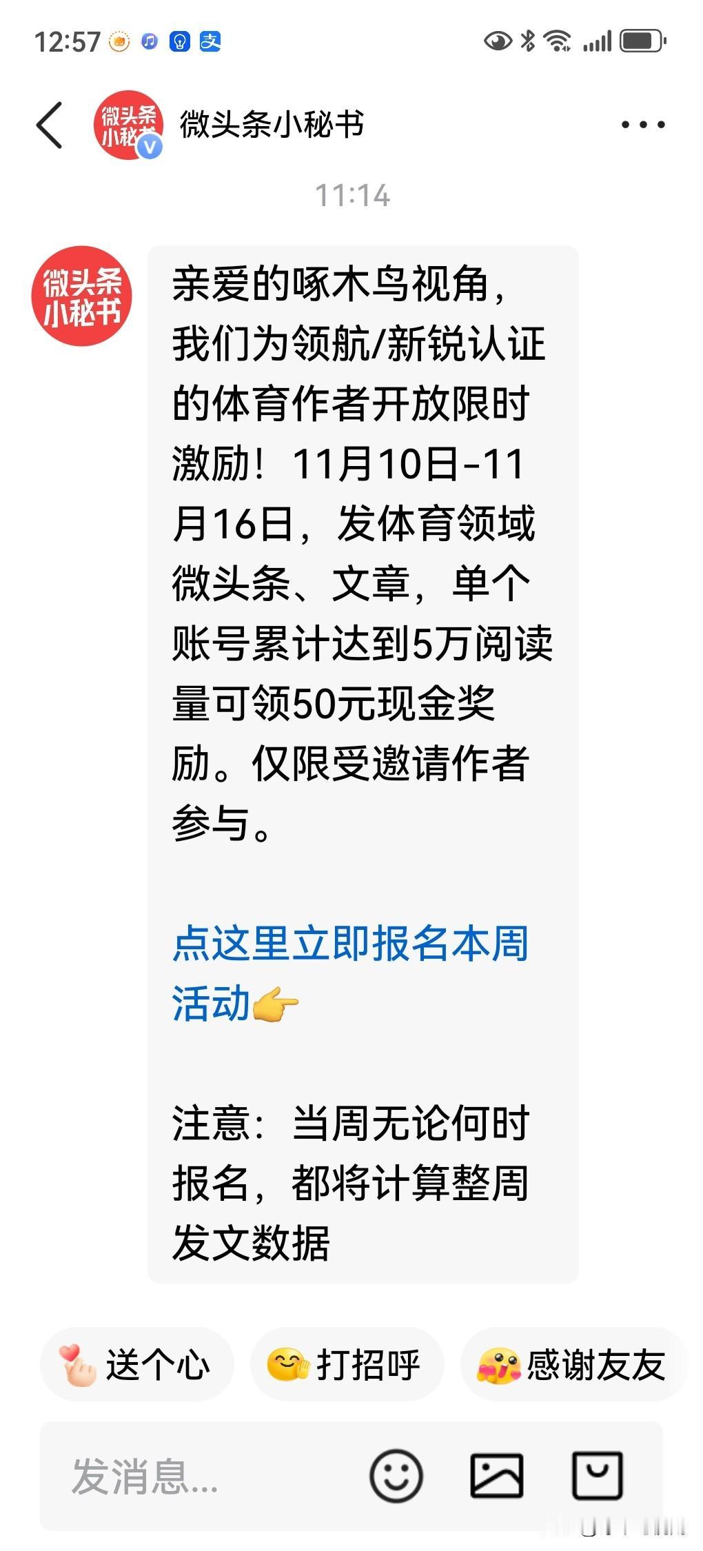 全运会如火如荼,在此之际,今日头条新一轮限时发文活动又开始了。 这次时间还是一周,11月10日到16日。但这次和前几次不一样的是,要求阅读量达5万,以前两次都是要求一万。还有头几次是不限话题,这次是仅限于体育话题。不知道要求你们的都是什么话题?反正我也不写别的,不限话题我也大多是写体育赛事。 上两周要求阅读量达一万即可,奖金66元。这次却要求五万阅读量,奖金50元。阅读量高了,奖金却降了。我猜测可能推荐机制又放开了,阅读量限制可能又宽松了。 本人这已经是第四次参加限时征文活动了。刚才我看了看微头条小秘书的消息,通知我参加此类活动还不止四次。可能是前面的咱没注意看,错过了,好可惜! 我参加这四次,第一次是9月16日到22日,要求阅读量五万,奖金在稿酬基础上翻2倍。10万阅读量翻2、5倍。那次虽然阅读量要求的高,但流量放的很开,还是比较容易达成的。 第二次和第三次都是要求阅读量一万,但由于平台改革,一万阅读量看似容易,但却一点也不比头一次那五万轻松。 感谢广大读者,和平台的推荐。这几次我都有幸达成目标了。 至于这次五万阅读量,我还是抱有充足的信心。条友们你接到通知了吗?我们一起加油!还有可能一篇过呢!