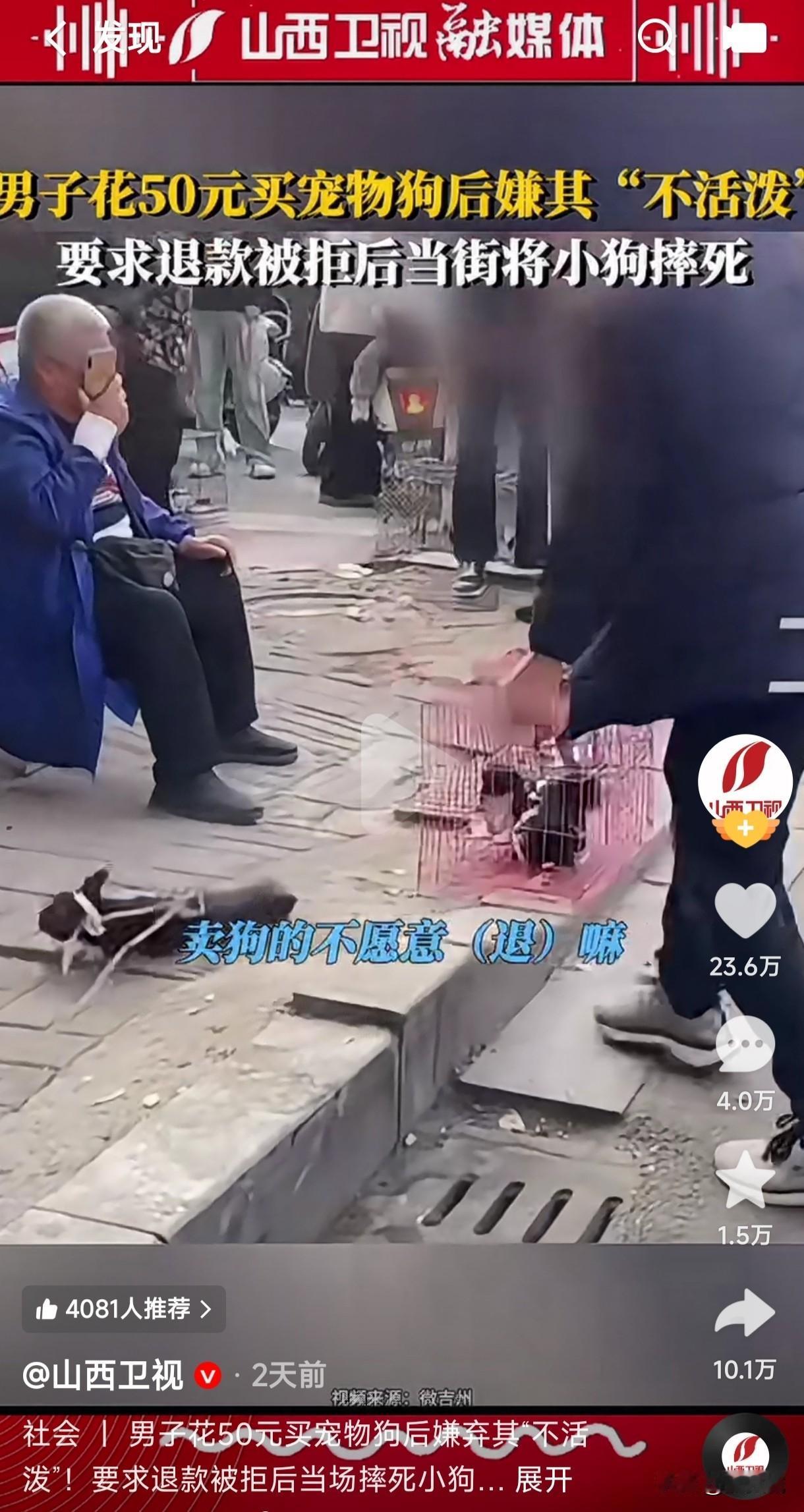 男子花50元买宠物狗后居然嫌弃不活泼,于是找卖狗的要求退款,卖狗的拒绝退款后男子当街把小狗摔死。 做买卖一个愿打愿挨,这卖狗的为了50元居然眼睁睁看着男子当他面把狗摔死,而这男子为了50元当街把一只活狗摔成了死狗,这是不是有点太残忍了?那可是一条活生生的生命,竟然亲手被他给摔死了,这是宁愿50块不要,也要让狗子死在自己手上吗? 不管路人如何去劝阻他,他依旧不听劝,坚持到底把狗子摔死扬长而去,这是大庭广众之下谋害动物的生命,这人的心太狠了,动物尚有怜悯之心,他为什么就没有呢?