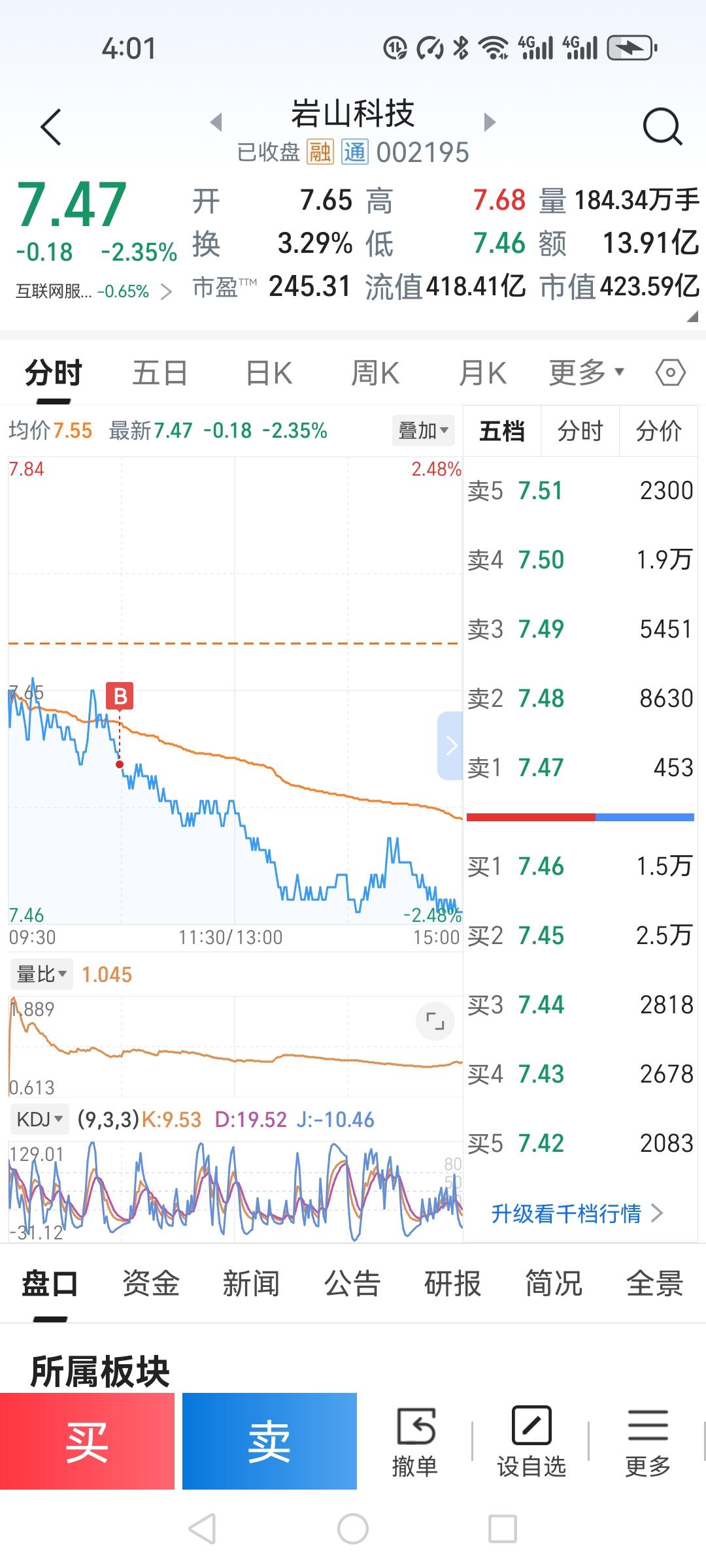 岩山科技真的没希望了吗? 这些日子岩山科技一直在7.6上下小幅震荡,昨天收十字星,今天开盘7.65,最后7.68,然后就一路下滑。收盘7.47,成交量比昨天略有放大,成交13.91亿,换手率3.29%,跌破了20日线,呈下降趋势。 好几天没有操作了,手又痒痒了,在上午,看到他一直没有跌破7.6,我就在7.6挂上,最后完美被套。 成本由7.77降为7.688,本想今天可以T一次,没想到做T不成反而被套。反思我今天的操作,纯属手贱,一直都在丁宁自己要有耐心,管住自己的手,结果一冲动就又入了套?真是后悔莫及,继续等待吧,决不割肉。
