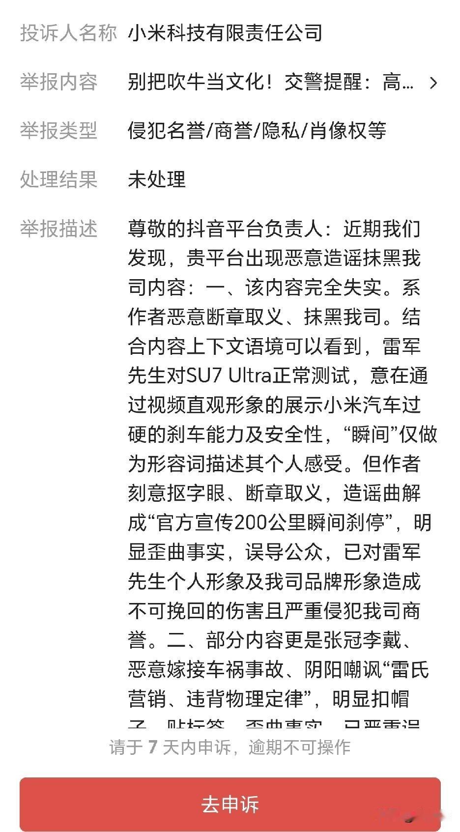 收到了 小米公司的投诉 小米公司说 瞬间,只是形容词 描述个人感受 您怎么看?