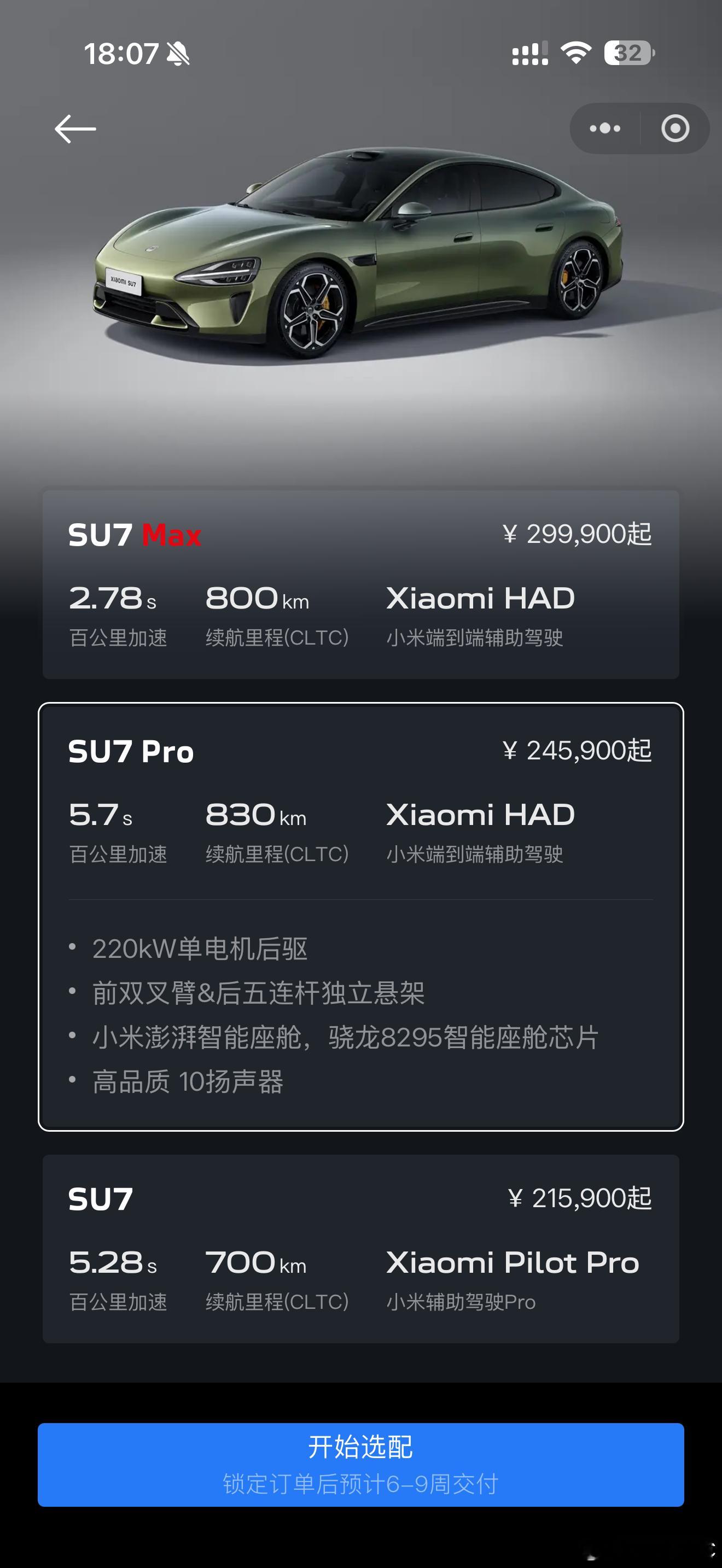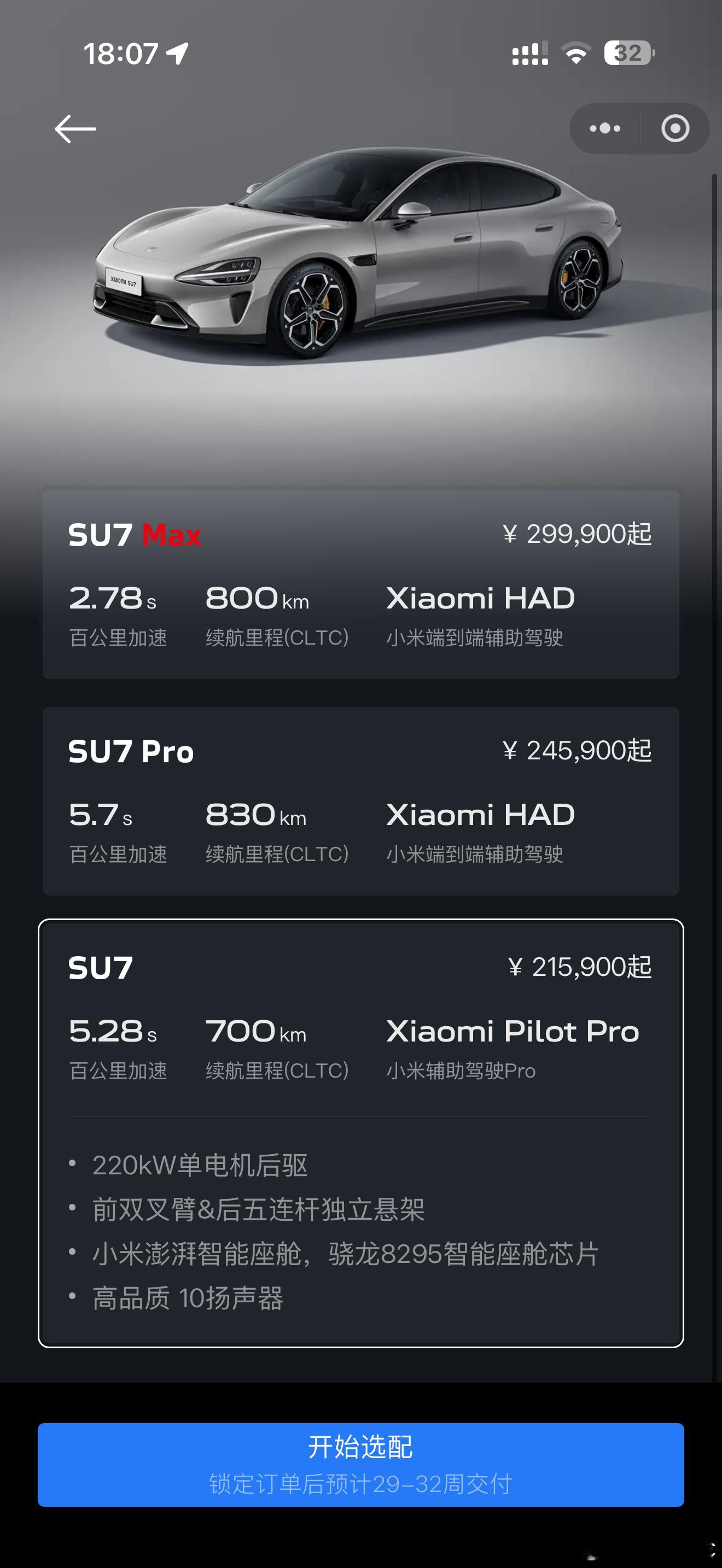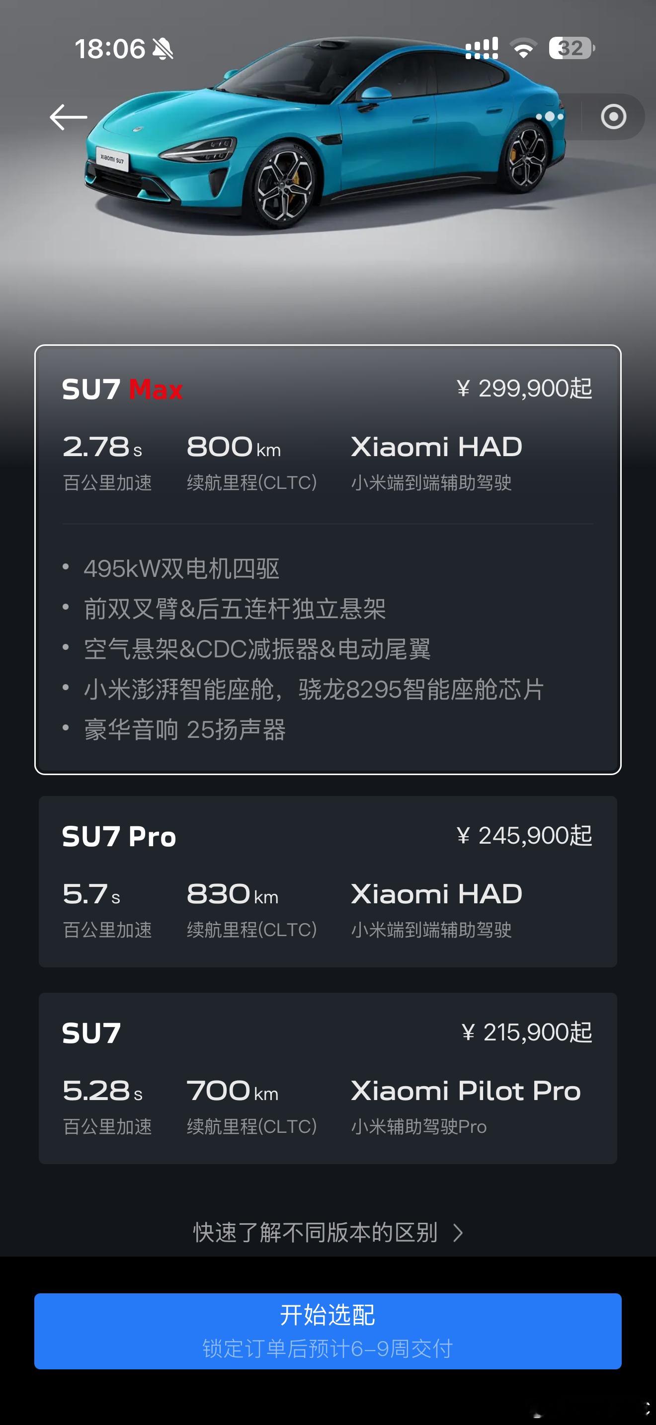 小米 SU7 等车周期更新——Max 和 Pro 版锁单等车仅需 6-9 周,标准版仍需29-32 周。这是改款要来的前兆?
