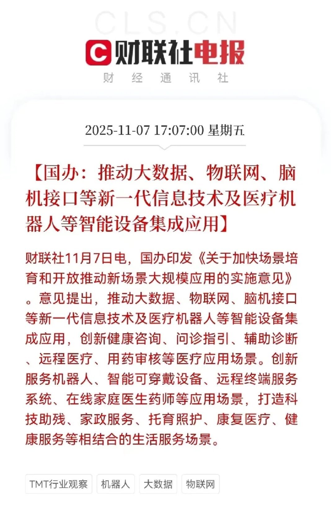 盘后利好落地!医疗信息化+脑机接口+医疗机器人,25只标的迎场景落地机遇11月7日,新场景应用相关政策正式发布,核心聚焦大数据、物联网、脑机接口等前沿技术与医疗机器人等智能设备的深度集成,重点拓展远程医疗、辅助诊断等医疗场景,以及科技助残、健康管理等生活服务场景。这一政策将直接带动医疗信息化、脑机接口、医疗机器人等赛道的需求释放,相关企业有望借助政策东风,加速技术落地与场景拓展,迎来发展新契机。政策受益核心标的全梳理一、医疗信息化(数据+平台支撑,筑牢场景落地基础)1. 东华软件:医疗信息化龙头企业,医疗大数据业务收入稳居行业第一,可搭建完善的健康医疗数据系统,为远程医疗等场景的数字化转型提供核心支撑,是医疗大数据领域的核心受益标的。2. 卫宁健康:医疗信息化头部玩家,旗下医疗数据平台能够高效支撑问诊指引等场景落地,2024年Q3毛利率达40.49%,业务结构与医疗场景技术集成需求高度契合。3. 嘉和美康:专注于电子病历与临床大数据系统研发,2024年Q3毛利率46.01%,其核心方案可助力医院诊疗流程智能化升级,精准匹配医疗场景技术集成方向。4. 东软集团:医疗信息化布局广泛,服务覆盖超2000家医院,具备搭建智慧医疗平台的核心能力,能够有效支撑远程医疗场景落地,契合信息化集成核心需求。5. 万达信息:健康云平台已覆盖10亿人口数据,可提供在线家庭医生等服务,完美匹配生活服务场景中的健康管理需求,政策适配性极强。6. 科大讯飞:医疗AI辅助诊断系统已渗透3万家基层医疗机构,语音技术赋能问诊流程智能化,深度契合医疗场景的技术应用趋势。二、脑机接口(技术突破+临床落地,打开医疗新空间)1. 创新医疗:通过参股博灵医疗布局侵入式脑机接口,核心产品BCI-4000已进入III期临床,上肢外骨骼康复系统处于试验阶段,直接受益于脑机接口与医疗机器人的集成政策。2. 中科信息:与浙江大学共建专项研究中心,拥有脑电波采集相关专利,光遗传闭环系统可适配智慧麻醉康复场景,精准匹配政策支持的医疗技术方向。3. 佳禾智能:与浙江大学合作深耕脑机接口领域,持有脑电波头戴设备专利,为华为代工的脑机头环年产能达1万台,是医疗级脑机场景的直接受益标的。4. 三博脑科:国内唯一获批开展脑机接口临床植入的民营医院,2024年已完成200余例“北脑一号”手术,成为脑机接口临床落地的核心承接方。5. 汉威科技:柔性脑电传感器技术全球领先,0.1mm超薄设计使成本降低50%,年产能达100万片,将直接受益于脑机接口核心器件的需求爆发。6. 高德红外:自主研发6.5万通道脑机芯片,芯片密度超Neuralink初代产品3倍,功耗控制在1mW以内,是脑机接口芯片端的核心受益标的。7. 岩山科技:sEEG电极脑电大模型识别率达91%,相关医疗设备已获二类认证,与华为联合发布“智慧医疗大脑”,深度受益于脑机接口与大数据的融合趋势。8. 翔宇医疗:计划2025年推出10余款脑机接口及外骨骼机器人产品,目前相关产品已进入150家医院,精准匹配康复医疗场景需求。9. 伟思医疗:非侵入式脑机设备市占率位居行业第一,新生儿脑电监测专利覆盖度达85%,适配中风康复等场景,契合政策支持的医疗技术方向。10. 雷迪克:通过收购傲意科技20.41%股权切入赛道,后者聚焦脑机接口与机器人融合领域,核心产品包括智能仿生手,直接跻身政策受益赛道。11. 心玮医疗:深耕脑机相关神经介入设备研发,产品可辅助神经康复场景落地,完美契合脑机接口与医疗设备集成的政策方向。三、医疗机器人+物联网医疗(设备集成+场景适配,激活终端需求)1. 乐普医疗:与华为合作将AI-ECG算法集成至华为智能手表,全面覆盖家庭医疗场景,契合物联网与医疗设备集成的政策需求,助力健康监测场景落地。2. 鱼跃医疗:智能制氧机已接入鸿蒙系统,激活量超200万台,血压监测设备成功集成至机器人终端,精准匹配物联网医疗设备的应用场景。3. 思创医惠:与华为联合发布鸿蒙智慧医院IoT平台,可实时监测手术设备运行状态,聚焦智慧医院物联网设备集成,深度契合技术融合政策需求。4. *ST工智:自主研发自决策静脉采血机器人,搭建AI+机器人核心平台,专注医疗机器人临床应用,完美匹配政策推动的集成落地需求。5. 亿嘉和:通过控股佗道医疗布局医疗机器人业务,核心产品供应各类医疗场景,契合医疗机器人与信息技术集成的政策方向,场景拓展潜力巨大。6. 机器人:医疗康养机器人产品矩阵丰富,外骨骼机器人结合AI技术可使康复周期缩短40%,将充分受益于医疗机器人场景应用的政策红利。7. 荣科科技:护理机器人可完成病房宣教等核心任务,与超聚变深度绑定提供智慧医院整体方案,精准契合医疗服务机器人的场景需求。8. 复星医药:重点布局手术机器人领域并推进临床推广,助力手术场景智能设备集成,是医疗机器人落地进程中的核心受益标的。总结本次新场景应用政策,核心在于推动新一代信息技术与智能设备在医疗、生活服务领域的深度融合,25只受益标的全面覆盖医疗信息化、脑机接口、医疗机器人等核心赛道,涵盖技术研发、核心器件、场景落地等全产业链环节。政策的落地实施,将加速相关企业的场景拓展与业务兑现,进一步释放赛道需求,为细分领域龙头带来长期发展机遇。