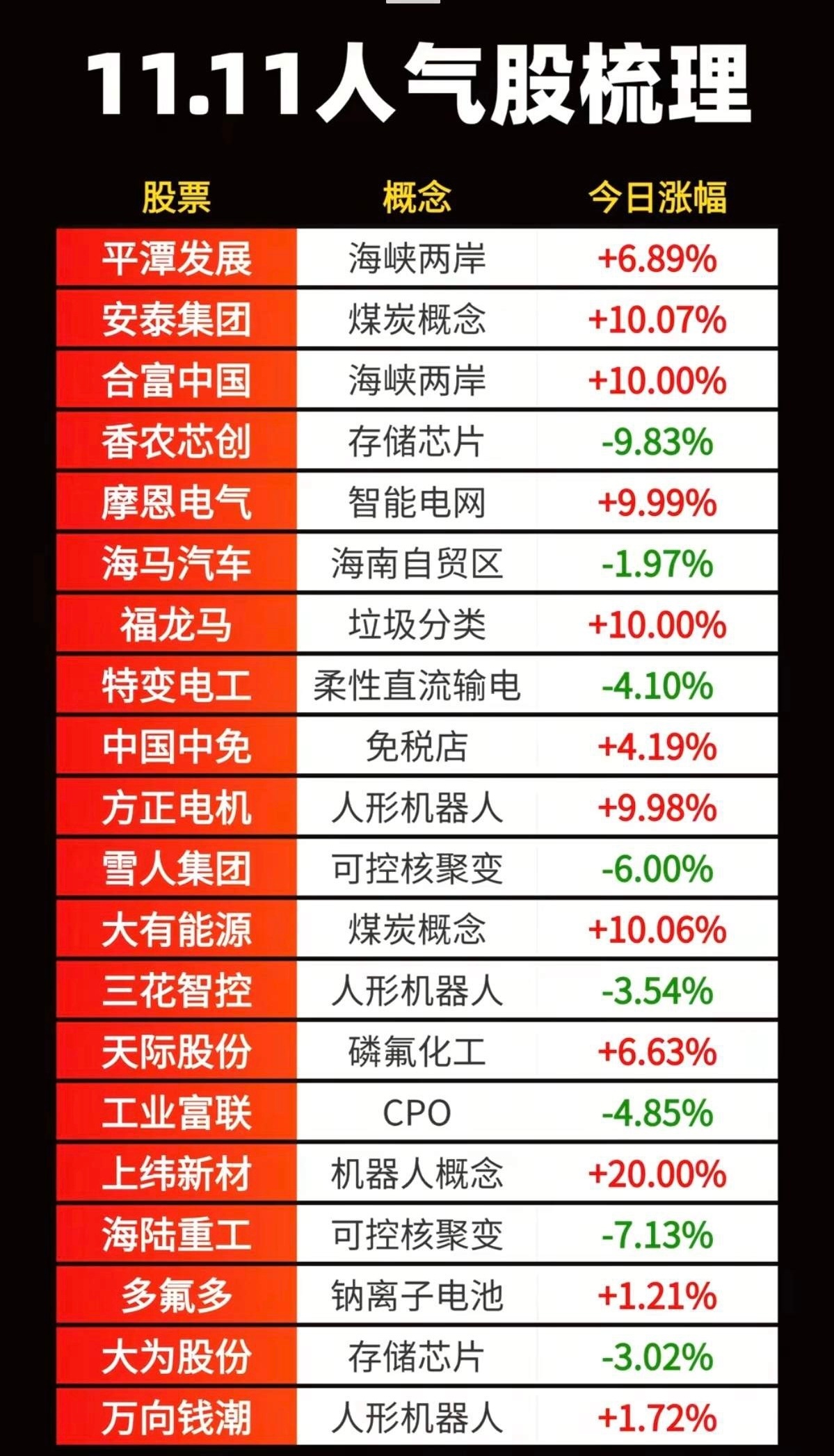 11.11周二收盘 成交活跃个股 人气榜!1.海峡两岸题材2.煤炭3.人形机器人4.免税概念5.可控核聚变