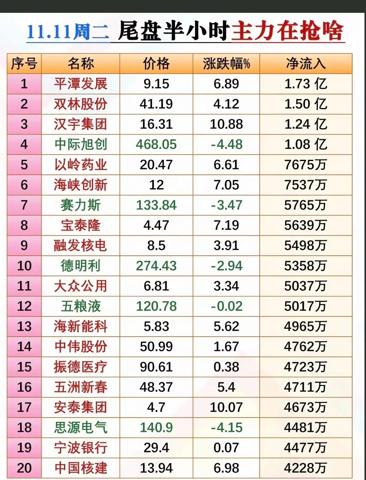 11.11周二尾盘半小时主力资金净流入梳理分析!今天呈现“涨追跌吸”的特征——既追涨地域、周期、涨停类热门标的,也低吸调整中的赛道龙头;覆盖板块包括福建地域、新能源(汽车/核电/锂电)、消费蓝筹、周期品、医药等,主力动向兼顾题材炒作与防御性布局,资金同时博弈短期题材情绪和赛道长期逻辑。个股分析1. 平潭发展:主力净流入1.73亿。作为福建区域基建/林业标的,尾盘主力借地域联动题材追涨布局,短期行情由福建板块情绪驱动,主业逻辑相对平淡,后续走势或绑定区域题材热度。2. 双林股份:主力净流入1.5亿。聚焦新能源汽车零部件赛道,尾盘主力流入配合小幅上涨,是新能源汽车产业链短期情绪回暖下的资金布局,属于细分赛道的阶段性修复机会,资金偏短期博弈。3. 汉字集团:,主力净流入1.24亿。尾盘涨停伴大额流入,是“汉字”相关情绪概念的短线炒作,无明确主业利好支撑,属于典型的题材驱动型标的,短期波动风险较高。4. 中际旭创:主力净流入1.08亿。光模块AI算力龙头,尾盘股价调整时获主力低吸,体现资金对光模块赛道长期逻辑的认可,是调整中的核心赛道标的抄底动作,博弈后续算力需求回暖。5. 以岭药业:主力净流入7675万。中药龙头标的,尾盘主力流入配合股价上涨,是医药板块短期情绪回暖下的资金布局,依托品牌与产品认知度,属于医药赛道的情绪修复型机会。6. 海峡创新:主力净流入7537万。福建区域科技类标的,尾盘主力流入延续地域联动题材热度,主业逻辑较弱,短期行情完全依赖区域题材情绪,资金属于题材跟风布局。7. 赛力斯:主力净流入5765万。问界新能源汽车核心标的,尾盘股价调整时获主力低吸,博弈新能源汽车赛道修复机会,后续走势或绑定问界车型的市场动态。8. 宝泰隆:主力净流入5639万。煤化工/新材料周期标的,尾盘主力流入配合股价上涨,是周期品板块短期情绪回暖的资金异动,布局煤化工赛道的阶段性机会,依赖周期品价格波动。9. 融发核电:主力净流入5498万。核电设备赛道标的,尾盘主力流入配合小幅上涨,受核电行业政策/项目动态带动,属于新能源赛道分支的题材型布局,资金关注赛道细分机会。10. 德明利:主力净流入5358万。存储芯片相关标的,尾盘股价调整时获主力低吸,博弈存储芯片产业链需求回暖的修复机会,属于半导体赛道的短期资金布局。11. 大众公用:主力净流入5037万。公用事业+创投标的,尾盘主力流入布局其“防御+题材”双重属性,既蹭创投短期情绪,也依托公用事业的稳定性,属于均衡型资金布局。12. 五粮液:主力净流入5017万。白酒龙头蓝筹,尾盘股价平稳时获主力布局,是消费蓝筹的防御性仓位,依托白酒板块的稳健性,资金偏长期配置型动作。13. 海新能科:主力净流入4965万。新能源(生物柴油)细分标的,尾盘主力流入配合股价上涨,是新能源赛道分支的短期情绪驱动,主业规模较小,行情依赖题材热度。14. 中伟股份:主力净流入4762万。锂电正极前驱体龙头,尾盘主力流入配合小幅上涨,蹭锂电材料价格回暖预期,属于锂电产业链的资金异动,布局赛道核心标的修复机会。15. 振德医疗:主力净流入4723万。医疗耗材标的,尾盘主力流入但股价微涨,是医疗板块的防御性布局,依托耗材细分的业绩稳定性,资金偏稳健型配置。16. 五洲新春:主力净流入4711万。高端制造(轴承)标的,尾盘主力流入配合股价上涨,蹭高端制造赛道短期热点,属于制造细分的阶段性机会,资金关注赛道情绪。17. 安泰集团:主力净流入4673万。焦炭周期标的,尾盘涨停伴主力流入,受益于焦炭第四轮涨价的业绩预期,是周期品涨价驱动的追涨动作,属于周期赛道热门标的。18. 思源电气: 主力净流入4481万。电力设备龙头,尾盘股价调整时获主力低吸,依托新基建电力设备的长期需求,是核心赛道标的的抄底布局,博弈后续赛道回暖。19. 宁波银行:主力净流入4477万。城商行龙头,尾盘股价平稳时获主力布局,是金融蓝筹的防御性仓位,依托城商行的业绩稳健性,资金偏长期配置。20. 中国核建:主力净流入4228万。核电工程建设龙头,尾盘主力流入配合股价上涨,受核电行业项目推进带动,属于新能源赛道工程端的细分热点,资金布局赛道机会。最后总结:尾盘主力净流入个股体现了主力“题材追涨+赛道低吸+蓝筹防御”的多元策略——既蹭福建地域、周期涨价等短期题材热度,也低吸调整的光模块、新能源汽车等赛道龙头,同时布局白酒、银行等防御性蓝筹。短期行情中,题材标的波动较大,而赛道龙头与蓝筹的稳健性更强,需区分不同标的的驱动逻辑以规避情绪退潮风险。
