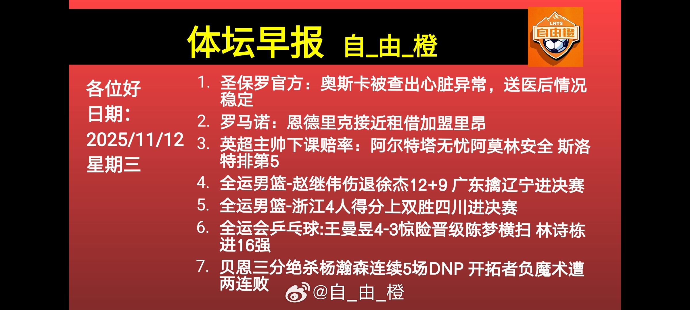 🌐《自由橙足球早报》 11.12 周三➭愿无大碍,圣保罗官方:奥斯卡出现心脏异常,送医后情况稳定➭官方:华金被任命为贝蒂斯俱乐部新任董事➭官方:帕拉迪诺成为亚特兰大新主帅,签约至2027年6月➭斯旺西官方:球队已正式解雇主教练希恩;带队19场6胜6平7负➭官方:尤文图斯与20岁前锋塞里涅-德梅续约至2028年➭本世纪意甲主帅被解雇次数榜:詹保罗9次居首,尤里奇5次➭土足协官方:涉嫌违规投注的多名土耳其国脚已被移出各级国家队大名单➭土足协公布全部1024名非法投注球员名单,土超三强仅费内巴切无人上榜➭索赔,7名被禁赛一年的马来西亚归化球员计划起诉马来西亚足协➭罗马诺:出任新帅,曼奇尼周三将飞往卡塔尔和萨德签约➭罗马诺:34岁J罗将自由身离开莱昂,加盟以来出战34场5球9助➭官方:央视频、央视体育客户端将转播熊猫杯中国U22vs越南U22➭暗示续约还是离队?刘洋晒与瓦科互换球衣照片➭官方:中乙兰州陇原竞技主教练于远伟辞职➭亚泰官方:蒋哲担任亚泰U21助教,李尚文担任亚泰U14主教练➭恰逢成都保卫战30周年,2025老甲A12月8日在成都双流开赛➭官方:定南赣联与外援埃里克斯完成续约,新合同到27年底➭广西平果外援阿萨莫阿颈椎骨折部位基本愈合,向医护赠送锦旗早安☀😃所有的付出都是一种沉淀,所有的美好终会如期而至。用心生长,追光而行,努力前行,向阳而生,我们都是和自己赛跑的人