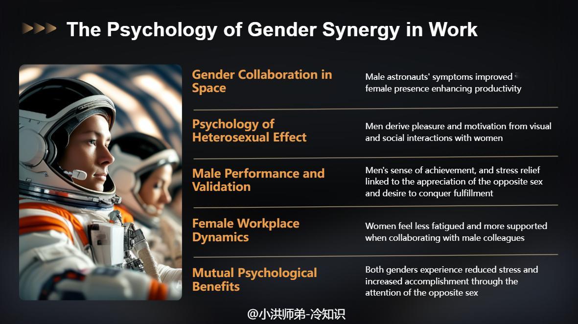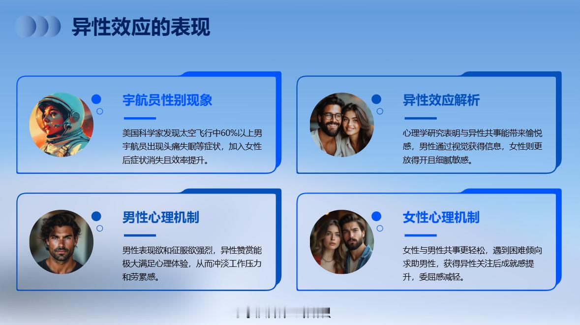男女搭配干活“不累”美国科学家曾发现一个有趣的现象:在太空飞行中,60%以上的宇航员会莫名地出现头痛、失眠、情绪低落等症状。有心理学家认为这是因为飞船上面都是男的。后来,有关部门挑选了一位女性加入到宇航员中,结果男宇航员们先前的不良症状都消失了,而且工作效率也大大提高。难倒这就是传说中的“男女搭配干活不累”吗?其实这种现象一点儿也不奇怪,它就是心理学上的“异性效应”。心理学家分析认为,与女人共事会让男人觉得格外愉快,且更有成就感。男性喜欢通过视觉获得信息,女性的容貌、发型等外部特征都能引起他们的兴趣,从而引起心理愉悦与兴奋。此外,男性有更强的表现欲和征服欲,在潜意识里渴望得到异性的赞美和欣赏。一旦得到异性的赞赏,他们的心理体验就会得到极大的满足,这就冲淡了劳累和压力。同样,女人总跟女人待在一起也会感到“疲劳”。她们在与男人共事时,不必为琐碎小事操心,更放得开。在工作遇到困难时,她们会自然而然地倾向于向男性求助。此外,女性的心思远比男性细腻,被同性关注和被异性关注的感觉是不同的。在得到男同事的关注或赞赏后,女性也会觉得更有成就感。这种心理体验得到满足后,她们就会觉得工作中的委屈和劳累减去大半。|||