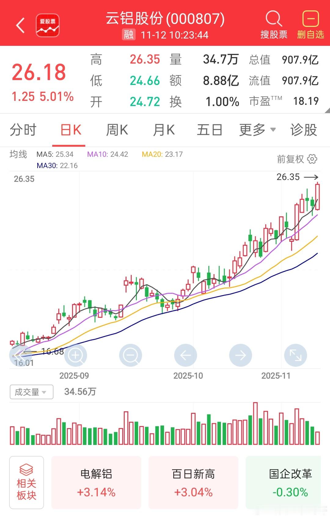云铝股份这趋势无敌,虽然冯哥已经止盈了,但不妨碍它今天继续新高,这一波上来确实厉