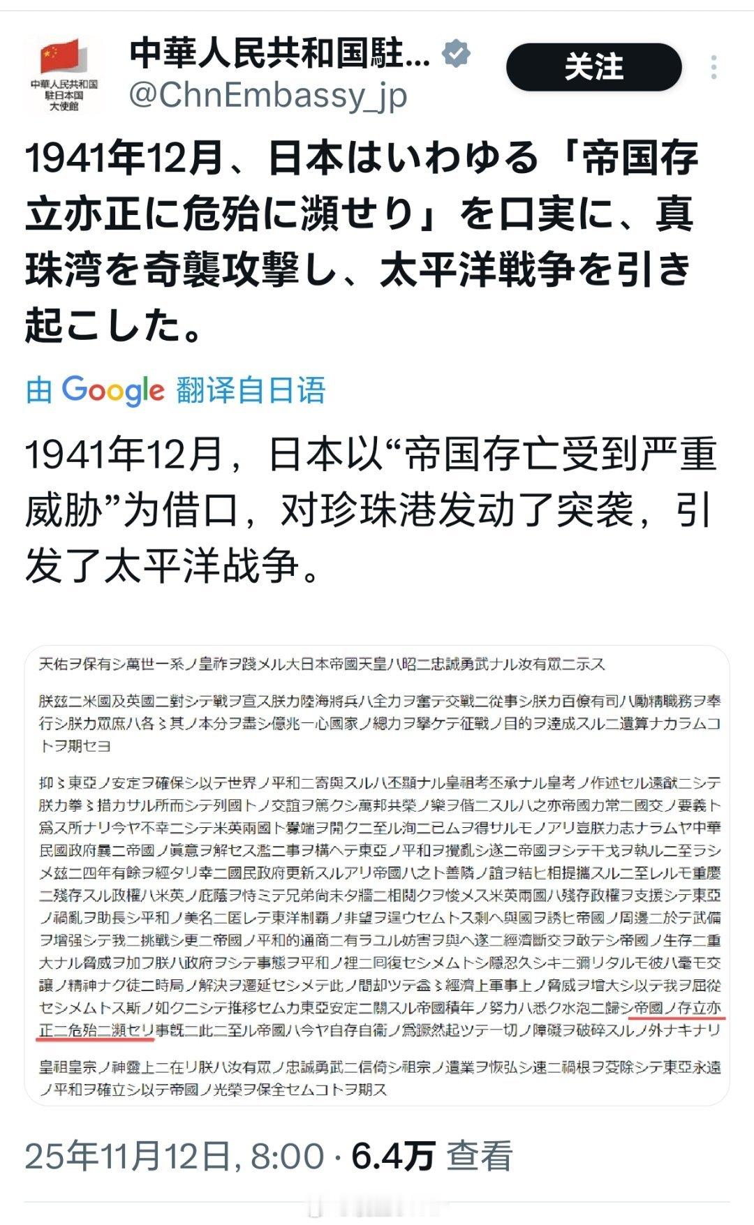 中国驻日本大使馆发帖,指出1941年12月,日本以“帝国存亡受到严重威胁”为借口,对珍珠港发动了突袭,引发了太平洋战争。