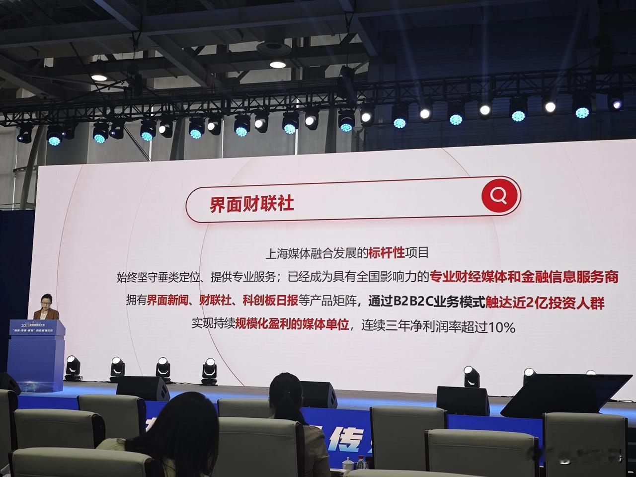 在2025年新媒体大会现场,我拍下了上海报业集团界面财联社党委书记、董事长 章茜老师分享的所有PPT。 界面财联社的发展目标,最为令人印象深刻——建成与上海国际金融中心地位相匹配的最具引领力和综合实力的金融信息服务平台,成为中国自己的“路透彭博”。 这种高举高打的使命感,应该是界面财联社一直保持领先的重要因素,比如连续三年净利润率超过10%。 这个发展目标,源自于实力,更能提供发展动力。