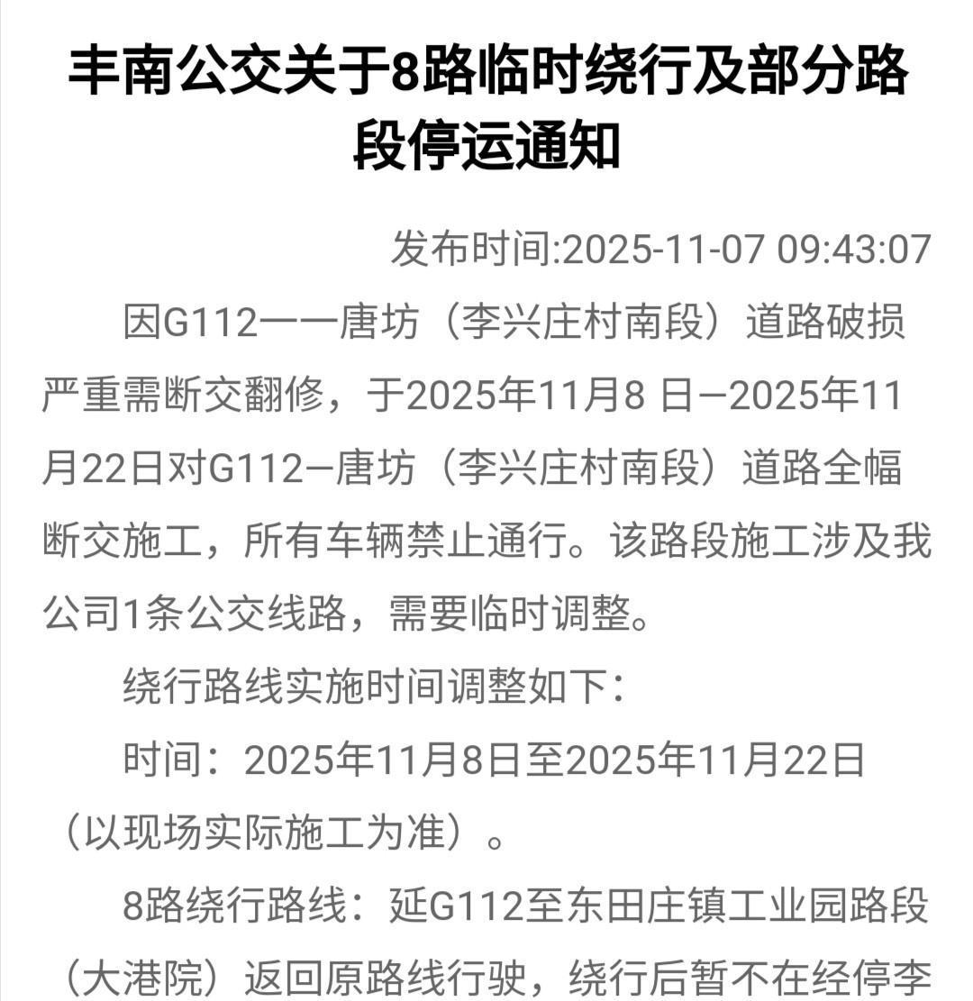 唐山公交最新调整:线路变更及空调期票价政策解读 近期,唐山市民在出行方面需留意公交线路的最新调整。据唐山公共交通集团有限公司及唐山兴丰公交公司官方发布的信息,以下是核心调整内容: 因112国道部分道路破损严重需进行维修,丰南8路公交将于2025年11月8日至11月22日临时绕行,具体走向有待线路实际运行情况释出。兴源道部分路段施工也涉及多条公交线路绕行,涵盖唐山公交集团的8条线路。同样提醒市民,绕行期间票价不变,但实际停靠站点需以动态指引为准。 从2025年11月15日起至2026年3月15日,全市165条公交线路将启用空调运营,并实行空调期票价。票价政策分为以下几类:一是全年一票制的特殊线路,如旅游观光巴士(2元),微循环线路(南、北循环线全年1元)等,票价维持不变;二是两条按站计费的线路(114路与210路),在基础票价上加空调期附加费1元;三是全年票价变更的特定线路,如游3路和207路从3元提升至4元,65路从2元提升至3元;除特殊规定线路外,其他市区公交统一实行非空调期1元、空调期2元的计费标准。这一票价调整旨在提升冬季出行舒适性,同时兼顾市民支付能力。 此次调整,既涉及道路维修导致的临时绕行,也反映了近年来城市公交服务的不断优化升级。市民可提前规划出行路线,关注动态调整信息,以便顺利应对短期的不便,同时享受更舒适的空调公交服务。 关于调整细则及票价变化,如需进一步了解,请参考唐山公交集团及兴丰公交公司官方公告,共享便民交通新模式!唐山公交9路 唐山公交38路 唐山公交24路 唐山公交64路 唐山公交77路 唐山公交89路 唐山公交60路