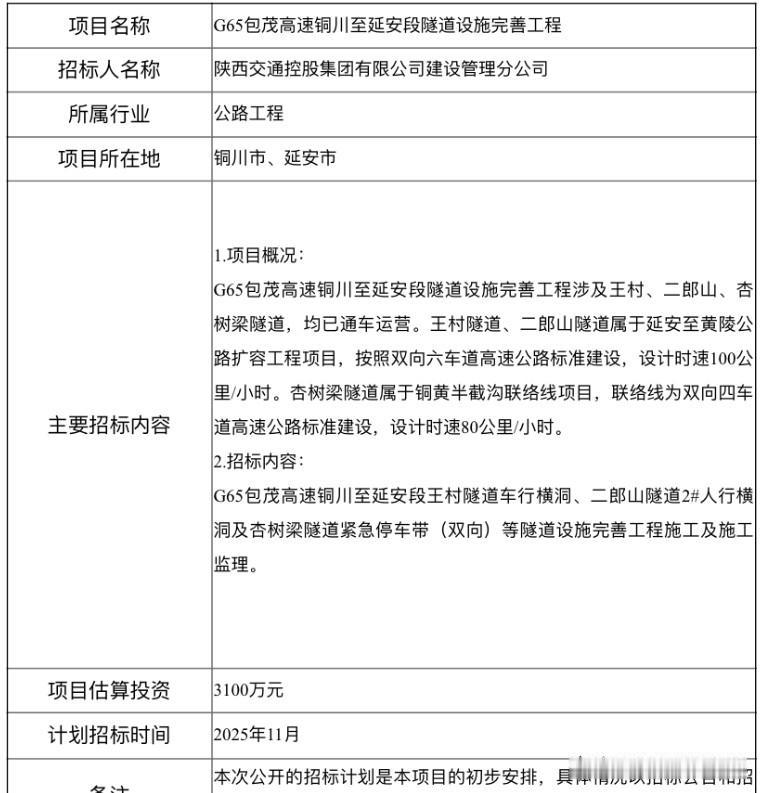 G65包茂高速铜川至延安段隧道设施完善工程 施工及施工监理招标计划 根据项目前期工作进展,现将G65包茂高速铜川至延安段隧道设施完善工程施工及施工监理招标计划公布如下。 项目名称:G65包茂高速铜川至延安段隧道设施完善工程 招标人名称:陕西交通控股集团有限公司建设管理分公司 所属行业:公路工程 项目所在地:铜川市、延安市 主要招标内容 1.项目概况: G65包茂高速铜川至延安段隧道设施完善工程涉及王村、二郎山、杏树梁隧道,均已通车运营。王村隧道、二郎山隧道属于延安至黄陵公路扩容工程项目,按照双向六车道高速公路标准建设,设计时速100公里/小时。杏树梁隧道属于铜黄半截沟联络线项目,联络线为双向四车道高速公路标准建设,设计时速80公里/小时。 2.招标内容: G65包茂高速铜川至延安段王村隧道车行横洞、二郎山隧道2人行横洞及杏树梁隧道紧急停车带(双向)等隧道设施完善工程施工及施工监理。 项目估算投资:3100万元 计划招标时间:2025年11月 备注:本次公开的招标计划是本项目的初步安排,具体情况以招标公告和招标文件为准。