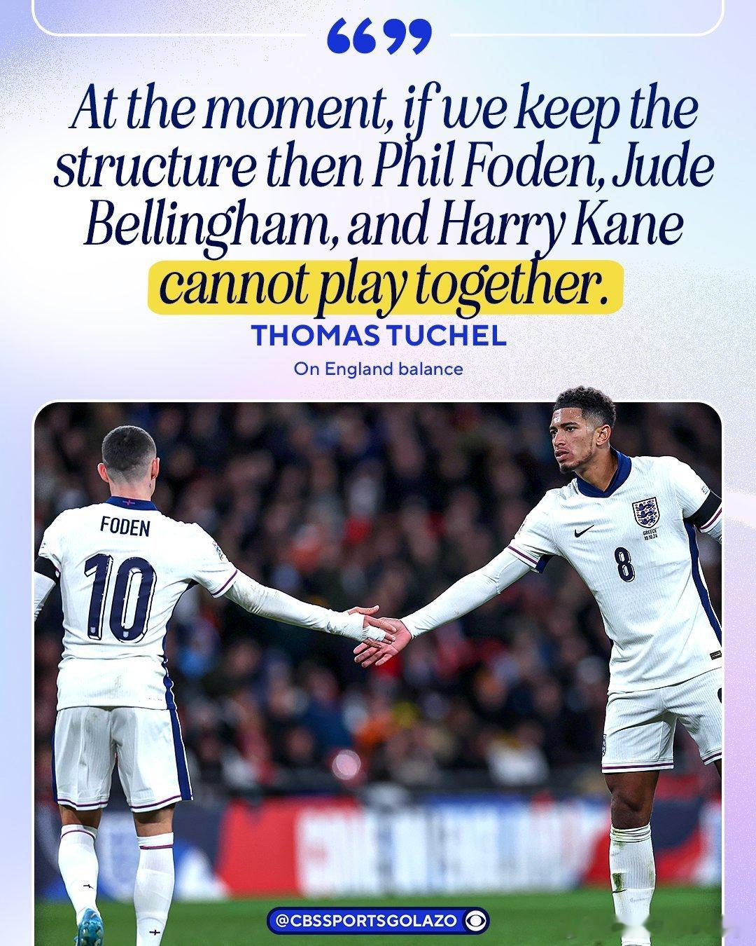 【无法共存❌】英格兰主帅图赫尔表示,他不会让凯恩、贝林厄姆和福登同时出场。图赫尔:“就目前而言,如果我们保持现有体系,他们无法同时上场。 他们可以踢,但不是在这个体系内,无法保持我们已打造的平衡。“并非指那种配备边锋的阵型,那些边锋如同各自位置上的专家。目前,我们使用一名6号位、一名8号位、一名10号位和一名9号位。“特别是在10号位上,人选高度重合。你想,福登可以踢那里,贝林厄姆也可以,还有罗杰斯,他在这个位置上为我们踢得非常出色。还有帕尔默,有吉布斯-怀特。所以球员很多,有可能我们不会带上所有人。“这不是因为我们不喜欢他们,也不是因为他们个人能力不够格,而是我们始终会做对球队最有利的事情。我们始终会为了赢球做最好的选择,我们始终会为了平衡做最好的选择,并且我们会努力保持阵容的清晰度,即使这意味着我们必须做出艰难的决定。我们在任何一次集训中都会做出艰难决定,等到参加大赛时,这也不会改变。”