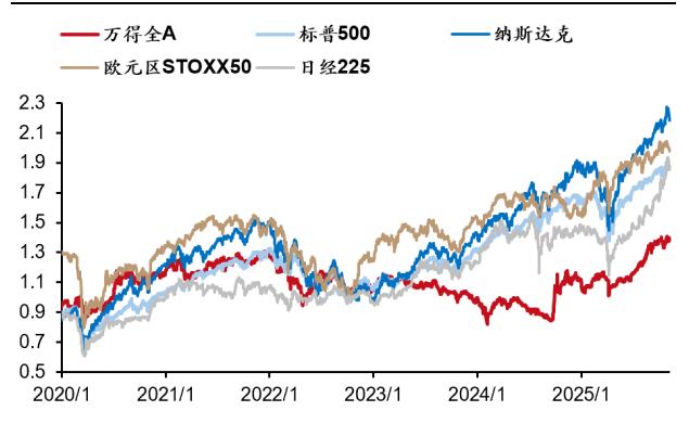 如果将时间维度拉长,并且将全球主要股市纳入比较,会发现从去年924开始的本轮A股牛市涨幅还是相对比较合理的。 本轮全球牛市的核心驱动因素还是疫情发生后的货币超发,目前境外资本对于A股的配置比例还未到标配,无论从流动性驱动的“水牛”角度,还是后续PPI CPI及反内卷驱动上市公司业绩改善的角度来看,现在必定不是A股本轮牛市的高点。