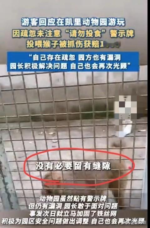 凯里动物园是红了,路也修好了,周边网红小吃店把人气也凑足了,各地打卡,贵州民族特色也都赶来支持院长了,可是,碰瓷的也来了。 一男子投喂不当,且围栏外面贴了醒目的“请勿投食”四个字,他还是看不见,投喂了一只院长“千叮呤万嘱咐”不要喂食的一只猴子,因为它脾气暴躁。 结果该男子以没看到为由,而且还指责院里,既然不能投喂了,为什么还和别的笼子一样,都有投喂的窗口呢,甚至还研究了铁笼,认为院里就是不完善,让猴子可以把手伸出来,抓伤顾客,故而索赔1000块钱合情合理。 这说的好像不让顾客投喂,难道亲自打理动物园的院长也不能投喂了吗,要饿死它吗,这理由实在太搞笑了,没看到院长有些投喂工具是一把很长的木勺子吗? 院长知道后积极的配合受伤的男子,叫他去打针,并且也按他的要求赔偿了,也再此后更是号召大家,不要去投喂贴了告示的动物,有些凶猛容易被抓伤,但只字不提被碰瓷了,只怪自己没有把院里弄的更完善,院长实在是太善良了。 以为这件事情因赔偿而过去了,可没想到这男子还开了视频继续提这件事,并且说不会退还这一千,这是他们本该赔偿的赔款。 人家都赔了,也没说退啊,他表示以后还会继续光临。广大网友希望下次眼睛睁大点,不要再去投喂不该喂的动物了哈,凯里走到今天也不容易啊。 (图片来自网络视频)