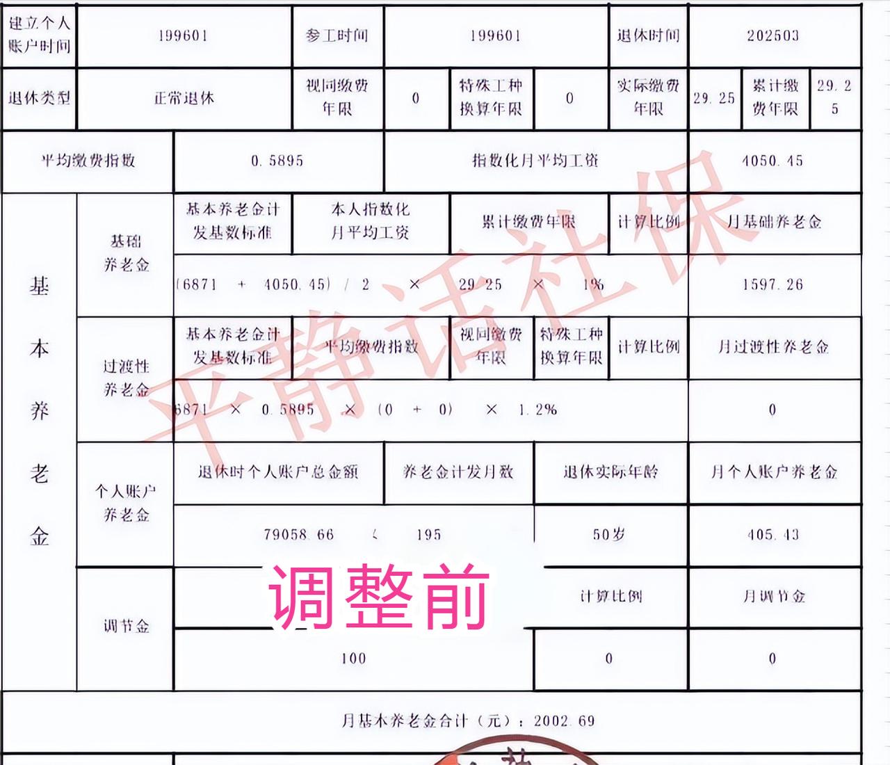 湖北省按照2025年计发基数重新计算的核定表已经可以查询。 下图为孝感养老金核定表,退休时间为2025年3月。 图一为调整前,计发基数6871,当时核定额为2002.69元 图二为调整后,计发基数7238,重新核定后为2088.01元 增加了85.32元,从4月开始补起。 如果没有过渡性养老金的,增加的只有基础养老金这项。 如果有过渡性养老金的,增加的是基础养老金和过渡性养老金两项。 今年退休的,赶紧上APP查询一下,看看自己涨了多少钱。