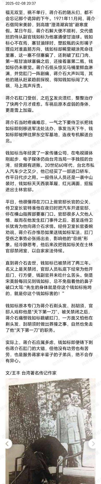 1969年,八十岁的宋霭龄从美国回台湾,跟蒋介石见面时,蒋一直扶着她的胳膊。旁边