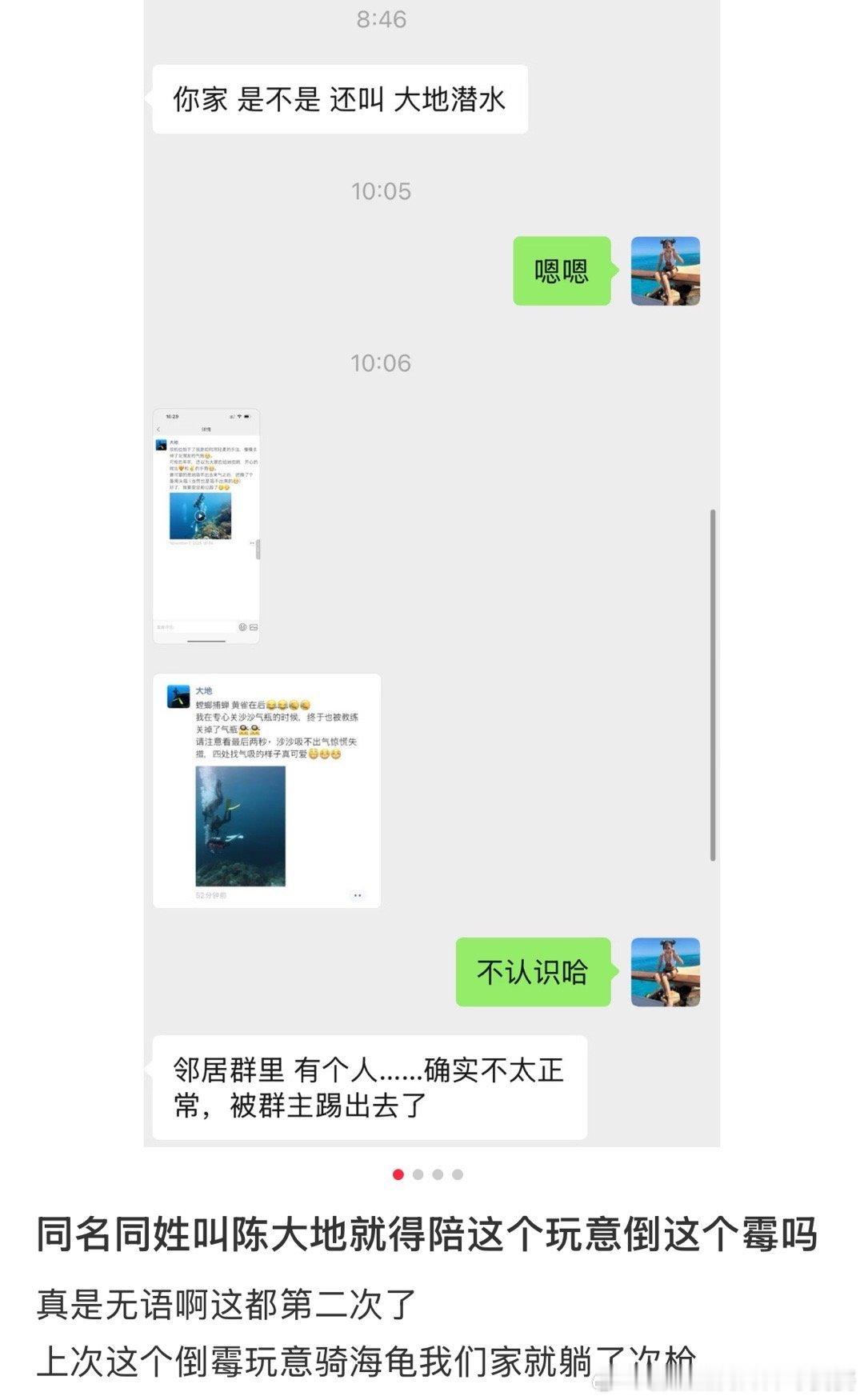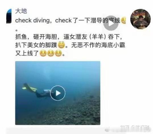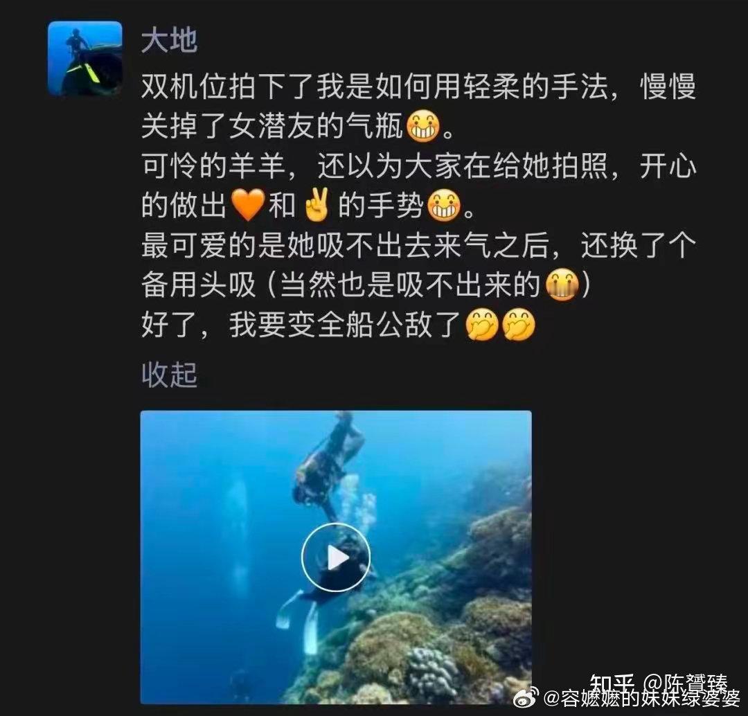 一位博主曝光了一个名叫Dadi chen的潜水爱好者(注:不是另一位叫Chen Dadi的潜水员,那位正常的潜水员已经被无辜波及遭殃了)。这玩意儿在水下关掉女潜友的氧气瓶气门阀,还好别的潜水者看到了,救下了名为羊羊的女潜友。这个人还在水下砸海胆逼人吞、拉拔掉女潜友的脚蹼。更早前还爆出他在水下骑海龟…他不是一个潜水教练。建议潜水组织吊扣他的潜水证。免得他去污染大海嚯嚯别人。