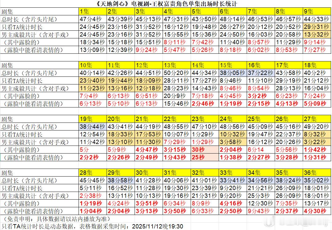 成毅天地剑心王权富贵-单集出场时长统计剧集总时长25小时56秒一番男主能看清表情的时长3小时占比不到12%