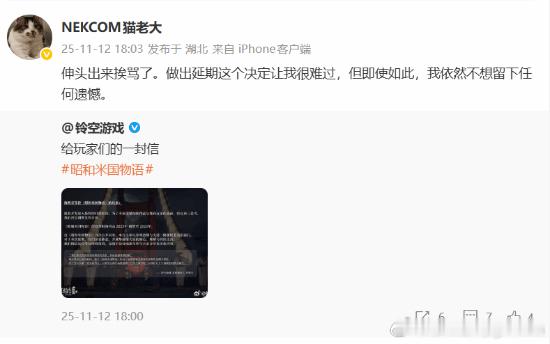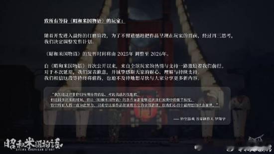 《昭和米国物语》宣布延期 制作人:伸头出来挨骂了铃空游戏今日发文宣布,《昭和米国物语》正式延期至2026年。官方表示:“对于本次延期,我们深表歉意,并诚挚感谢大家的耐心、理解与持续支持我们相信这段等待终将值得,也迫不及待地想尽快与大家分享更多新内容。”而后,游戏的创意总监和制作人猫老大转发了该生命表示:“伸头出来挨骂了。做出延期这个决定让我很难过,但即使如此,我依然不想留下任何遗憾。”
