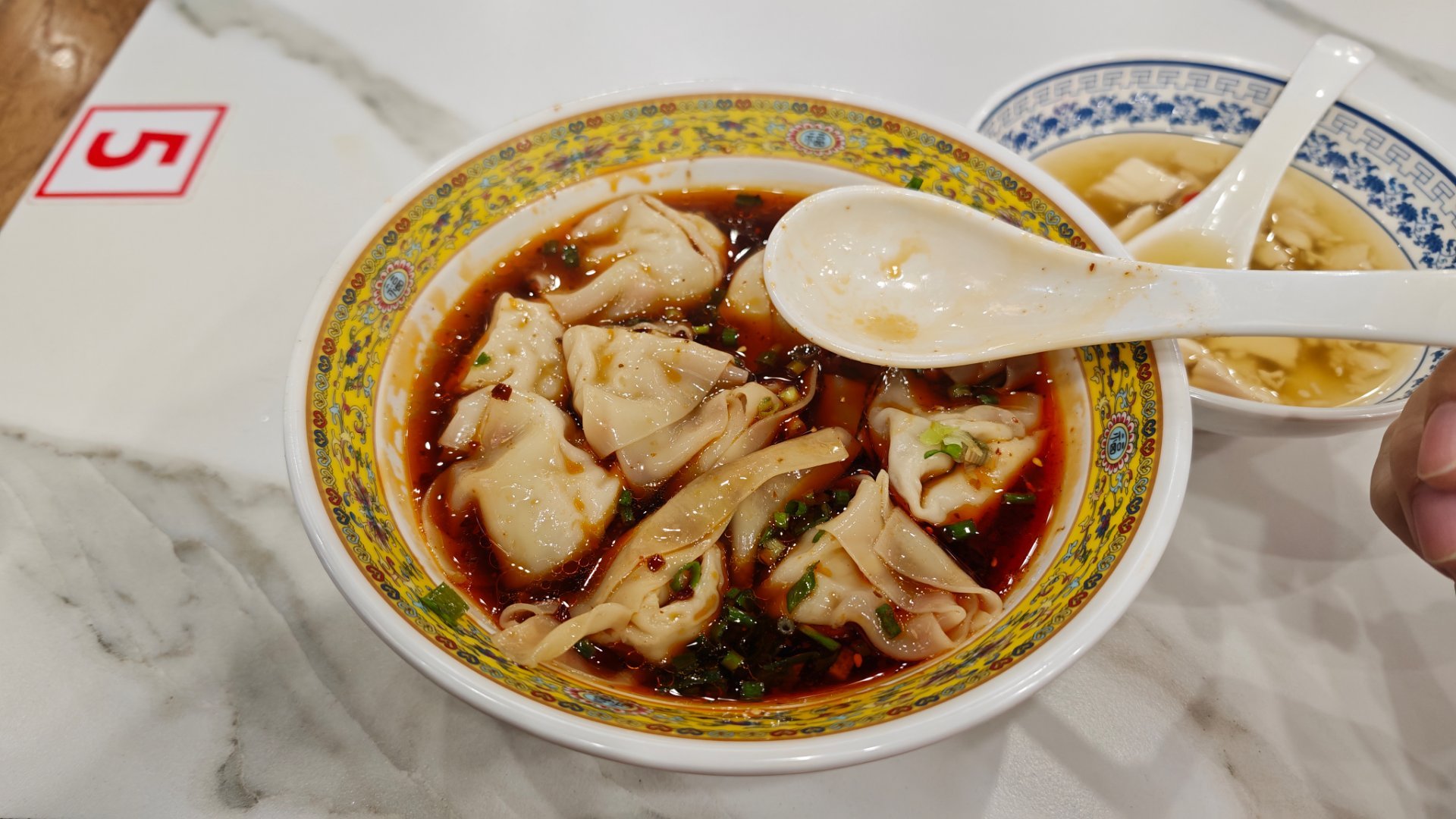 特别奇怪的早餐麻辣龙抄手配的红糖豆花