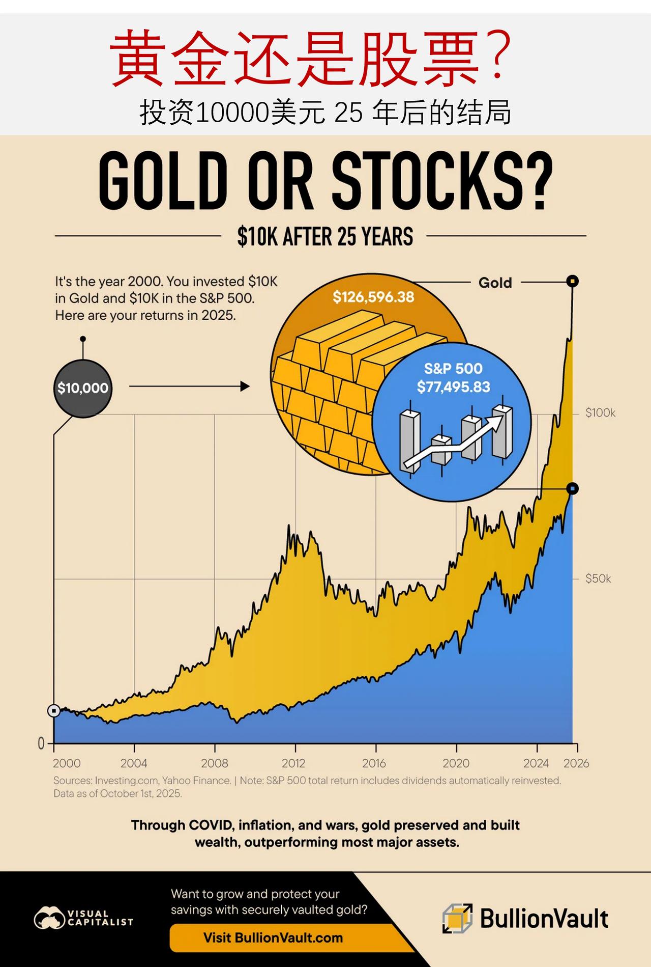 黄金还是股票?投资10000美元 25 年后的结局比较 投资者们一直都在问一个简单的问题:是投资黄金还是投资股票?自 2000 年以来,一系列的危机、通胀飙升以及政策调整考验了两者的表现。 这张图表展示了在 2000 年 1 月至 2025 年 10 月期间,10000 美元的投资分别用于黄金和标准普尔 500 指数的情况。数据来源于 Investing.com 和Yahoo! Finance。 10000 美元是如何在不同周期中实现增长的? 根据最新数据,10000 美元的黄金价格收于 126596.38 美元,而 10000 美元的标普 500 指数期货收于 77495.83 美元。因此,在同一时间段内,黄金的年复合增长率达到了 10.4%,而股票的年复合增长率则为 8.3%。 截至 2025 年 10 月 1 日,黄金投资的价值多出为 49,100.54 美元,比标准普尔 500 指数高出 63.4%。 ——为何黄金价值领先于股票价值? 在 2001 至 2002 年、2008 至 2009 年以及 2022 年期间,股票经历了大幅下跌,即便有股息收入,这种下跌也降低了资金的复利增长速度。 与此同时,黄金得益于不断上升的通货膨胀、货币波动以及来自中央银行及其他公共机构的持续购买。 值得注意的是,在 2024 至 2025 年期间,黄金价值达到了历史高位,而当时宏观经济风险依然居高不下。黄金价值分析 黄金保值