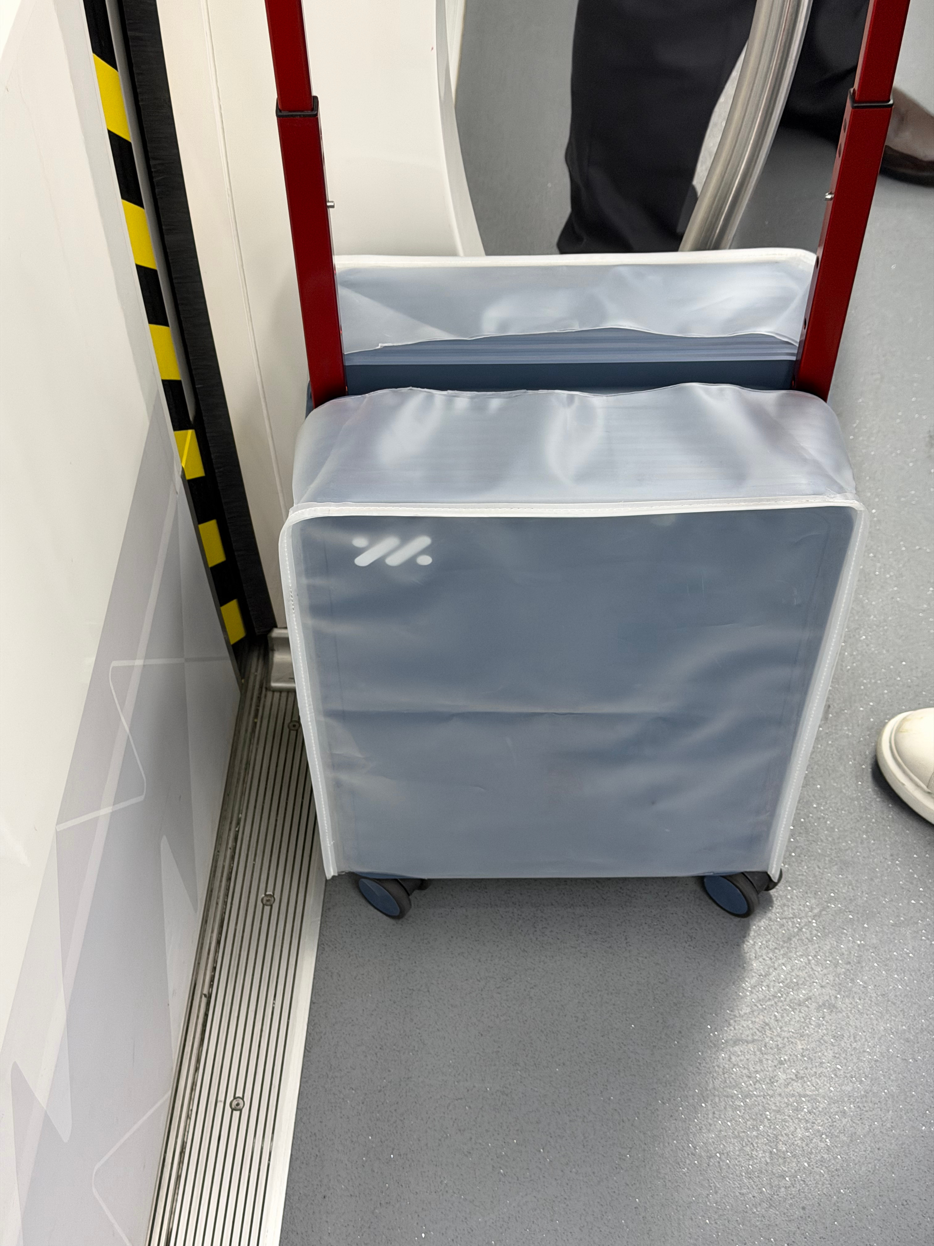 有点意思,这个旅客居然提的是智己的登机箱,保护的很好啊