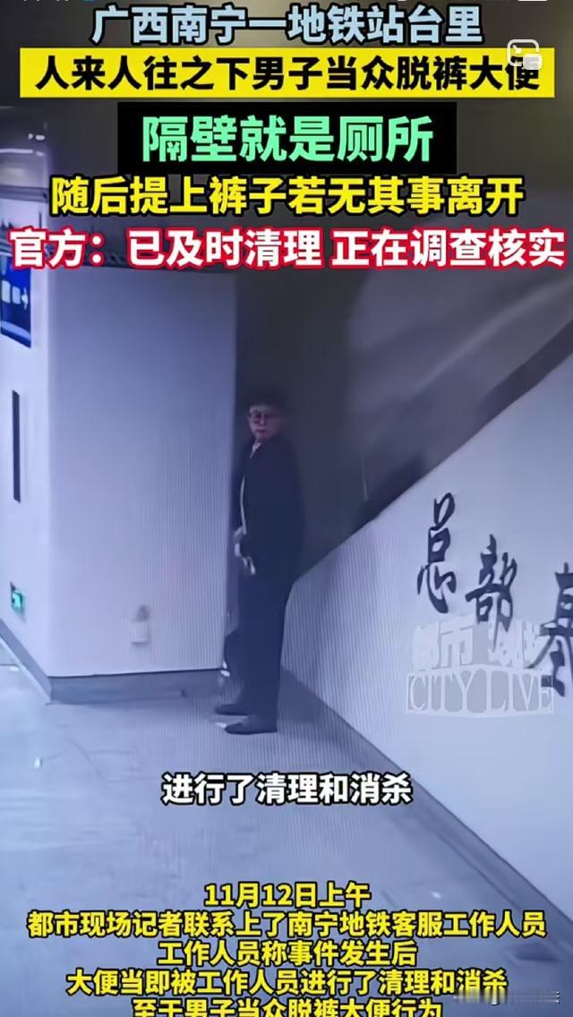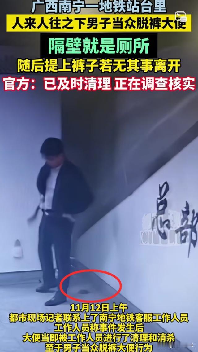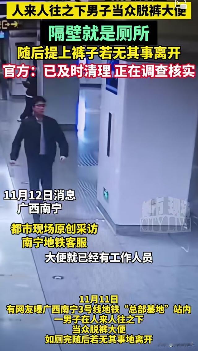 广西南宁,一男子地铁站里内急,可明明旁边2米就有卫生间,男子却当众脱了裤子拉屎,随后屁股都不擦若无其事离开。 据江西都市现场报道,11月11日,一网友在南宁3号线地铁“总部基地站”拍到了让人无语的一幕。 当时地铁站里人不多,一名穿着夹克、拿着水杯、戴着眼镜的年轻男子走进地铁站。男子打扮看起来非常正常,神态表情也不像精神有问题。 可他四处观察了一番后,见无人注意到他,竟走到一堵墙后的拐角处,双手解起了皮带,随后将裤子往下一扒,就蹲在原地大便起来。 这一幕刚好被远处一个网友拍到,他大为震惊,因为当时虽然不是高峰期,但来来往往的人也不少,这名男子竟然大庭广众之下当众光屁股拉屎! 而且,更让网友不能接受的,那个拐角旁边不到两米就有一个卫生间标志,也就是说,卫生间离男子只有几米! 男子蹲在地上,神态没有丝毫不适,很快,男子站起来提上裤子,连屁股都没擦,就这样大摇大摆离开了。 网友赶紧将这件事报告给了地铁站的工作人员,地铁站立即安排了人过去清理并进行消杀。 网友将这件事发出去后,一时之间引起轩然大波,谁也想不到,21世纪,竟然有素质如此低下的人。 事情引起关注后,地铁站回应称,男子当众脱裤子大便一事,已经在调查核实了。 事情发生后,有人猜测,可能当时卫生间人满了在排队,有时候内急确实憋不住,也只能这样解决了。 也有人说,不可能出现这种情况,地铁站到处都是厕所,而且视频中,地铁站里很明显并没有多少人,这人就是故意的! 那么,男子当众大便的行为应该如何认定?是否违反法律规定? 《治安管理处罚法》第二十三条规定,扰乱车站、港口、码头、机场、商场、公园、展览馆或者其他公共场所秩序的,处警告或者二百元以下罚款;情节较重的,处五日以上十日以下拘留,可以并处五百元以下罚款。 男子在地铁站这种人流量巨大的公共场所公然脱裤大便,他的行为非常容易引起周围人的不适和混乱,对地铁站正常的公共秩序造成了扰乱。 这种不文明且违背公序良俗的行为在一定程度上干扰了地铁站内的正常秩序,符合扰乱公共场所秩序的特征,男子可能会面临相应的拘留和罚款处罚。 另外,男子虽然是在解决和人生理需要,但他当众脱裤子的行为,属于当众裸漏身体。 《治安管理处罚法》第四十四条规定,猥亵他人的,或者在公共场所故意裸露身体,情节恶劣的,处五日以上十日以下拘留。 男子在人来人的地铁站里当众大便,行为恶劣性较为明显,严重违背了道德和公序良俗观念,对周围人的视觉和心理造成了冲击,侵犯了他人在公共场所享受文明、健康环境的权利,因此应当受到相应的处罚。 最后,《民法典》第八条规定,民事主体从事民事活动,不得违反法律,不得违背公序良俗。 公序良俗是公共秩序与善良风俗的简称,是社会全体成员所普遍认可、遵循的道德准则。 男子在地铁站内当众脱裤大便的行为,给目睹该行为的人造成心理不适,严重违背了社会的善良风俗和正常的公共秩序。 因此,从法律角度来看,男子的行为已经不局限于道德和素质问题了,而是明显违反了相关法律规定,应当接受处罚。 当然,如果案发时男子因自身身体突发疾病等特殊情况导致其无法及时赶到卫生间,则不构成上述问题。 作为公共场所,维护地铁站良好的秩序和环境是保障公众正常出行和生活的重要方面。 男子这种行为应该受到处罚,这不仅是对其违法行为的纠正,也是对公共秩序和公序良俗的维护,起到警示他人、引导公众遵守法律法规的作用。 对于男子的行为,您怎么看?