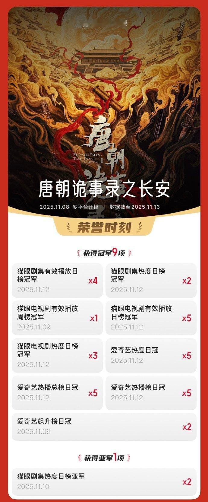 唐诡3有效播放量已破3亿,唐朝诡事录之长安猫眼电视剧热度日冠,咱就说我们唐诡的故事真的很好看,继续跟随卢凌风探案啦~