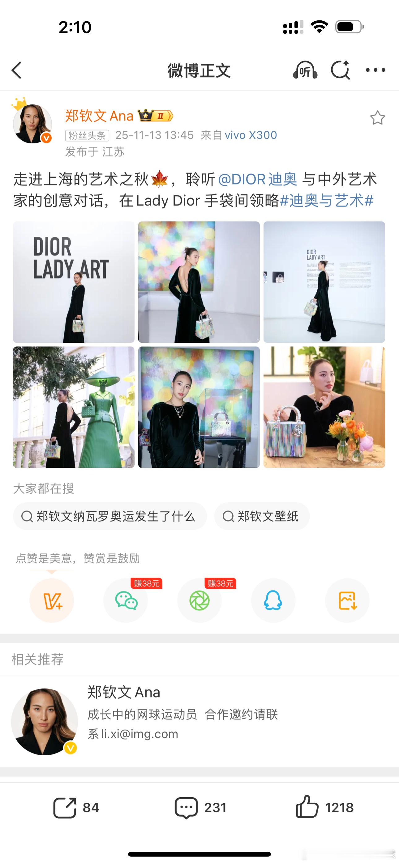 dior lady art郑钦文hold全场郑钦文发博:“走进上海的艺术之秋🍁,聆听DIOR迪奥 与中外艺术家的创意对话,在Lady Dior 手袋间领略迪奥与艺术”时尚中融入运动元素,独一无二,郑钦文hold全场