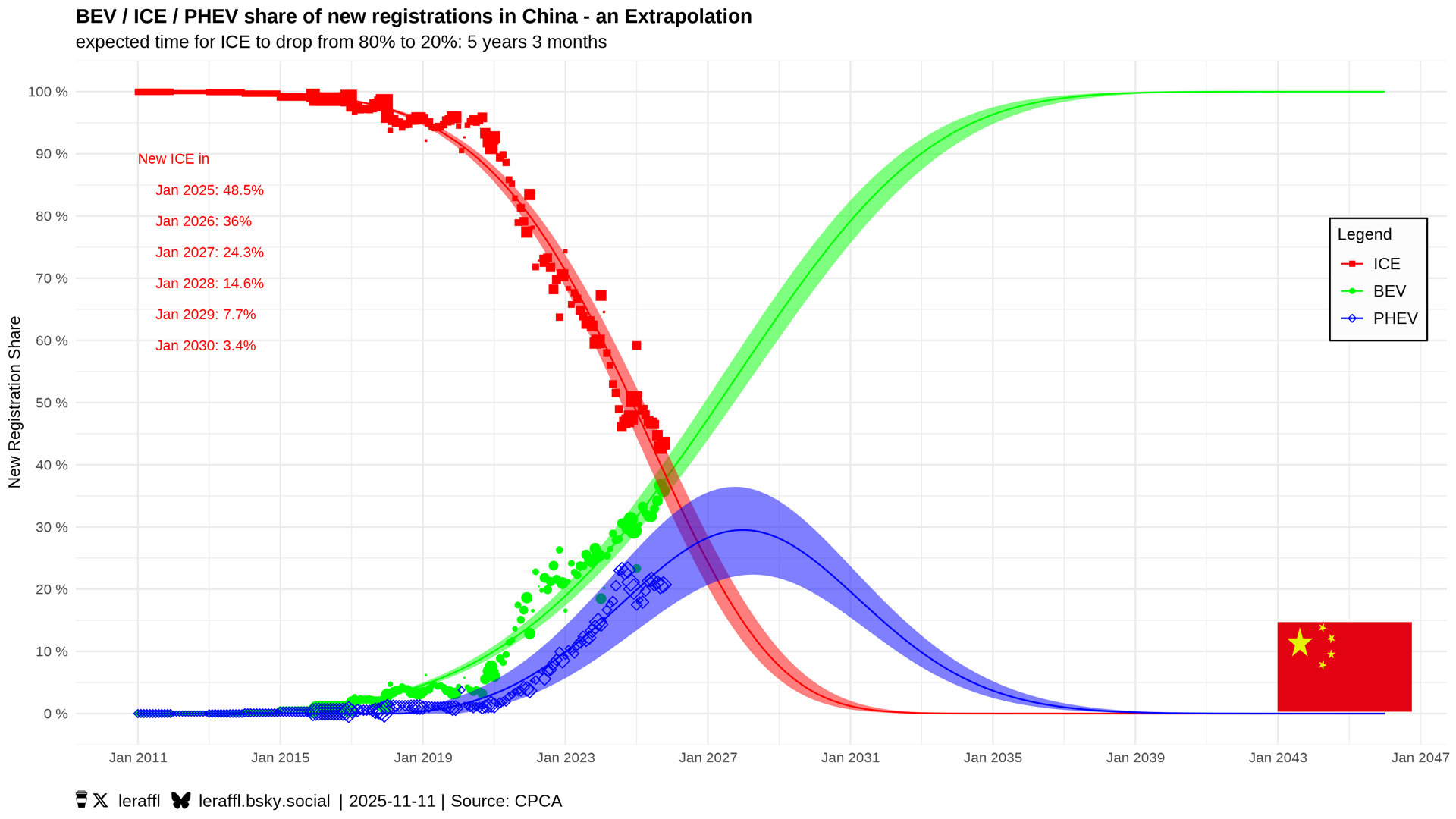 国外一数据统计师@ LeRaffl 预测中国燃油车在2030年左右消失… 纯电动车份额将在2033年达到90%,与此同时插混份额将在2027年左右达到峰值后逐渐减少。大家可以马克一下这条微博,看看他的预测和真实值之间差距多大