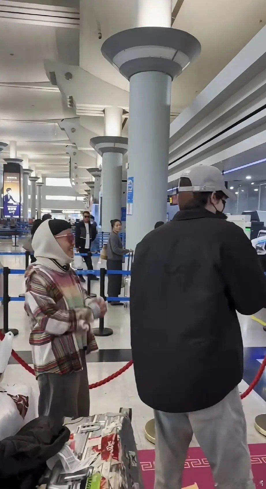 金龟子独自现身机场裹了个毛线围脖,脸比较老,竟然像是金龟子奶奶,个子好矮,与对面的帅哥反差大,但人气挺高的,因为不断有路人回头看她。