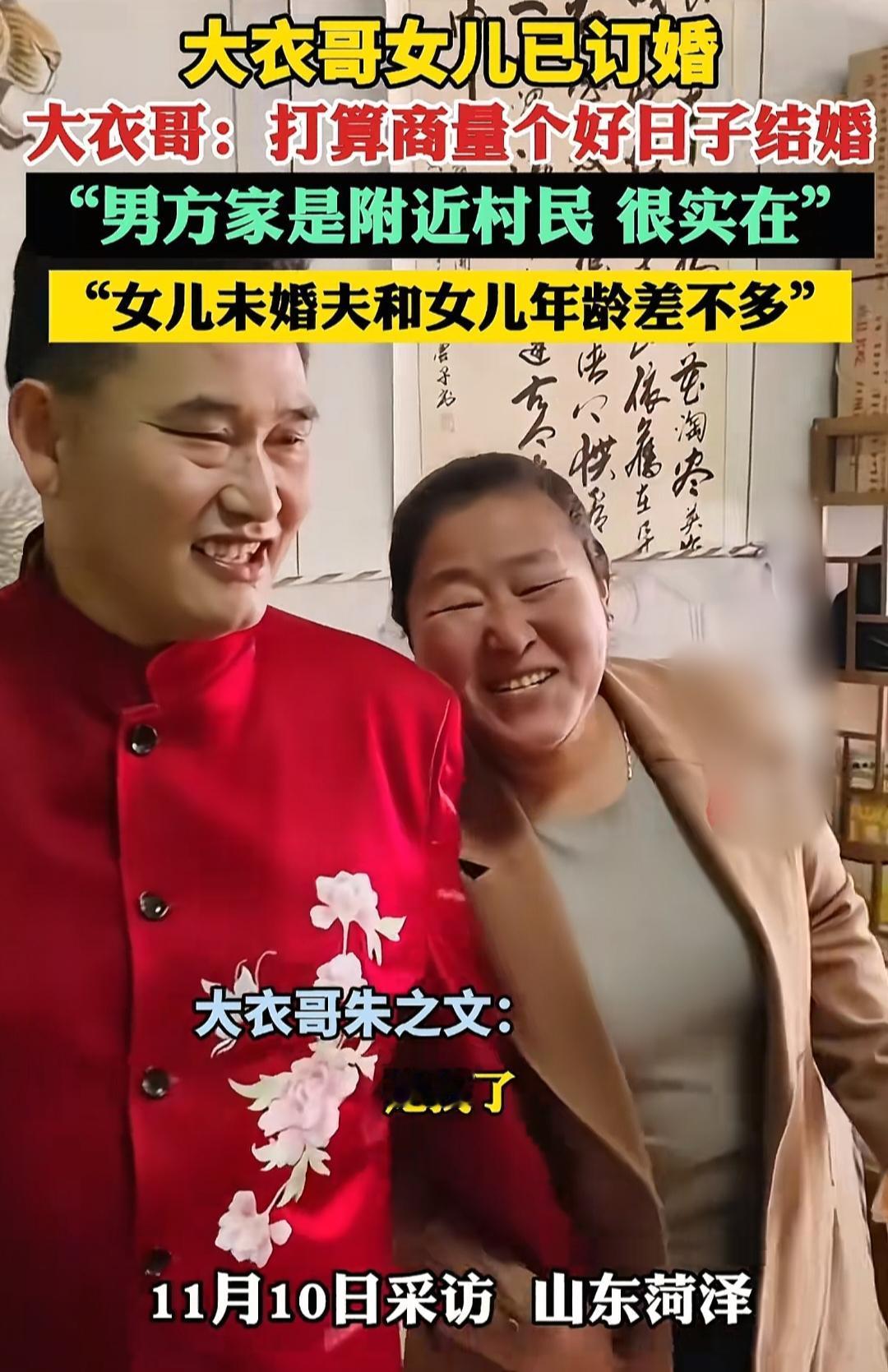 大衣哥朱之文家又迎来喜事了! 大衣哥女儿终于找到了属于自己的另一半。 前几年,大衣哥夫妇为了儿子的婚事可谓操碎了心。 其儿子差点被第一任妻子给"毁"了,好在大衣哥方面果断和女方切割清楚。 后来这个媳妇是老师,和朱小伟倒显得十分般配,而且还诞下了儿子。 如今,让大衣哥担忧的女儿也已经订婚了,未来老公是本地人,二十四五岁,和大衣哥女儿年纪相仿。 据大衣哥透露,女婿一家都是务农的,为人都很老实。 希望如大衣哥所愿,男方是真正看上了其闺女,而不是物质条件。 大衣哥