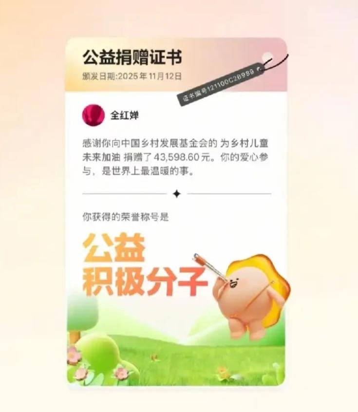 也就全红婵敢这么干 前脚直播收的礼物 后脚43598.6元全部捐给了 中国乡村发展基金会 全红婵直播人气高真不错,直播礼物捐赠行为可增加明星的社会影响力,传播正能量。为可爱的全红婵小妹妹点赞! 这还只有1小时,我那个时候没刷抖音,如果进了抖音会是那800万零1个。 全红婵格局绝了!把大家的喜爱变成公益微光,又励志又暖心!