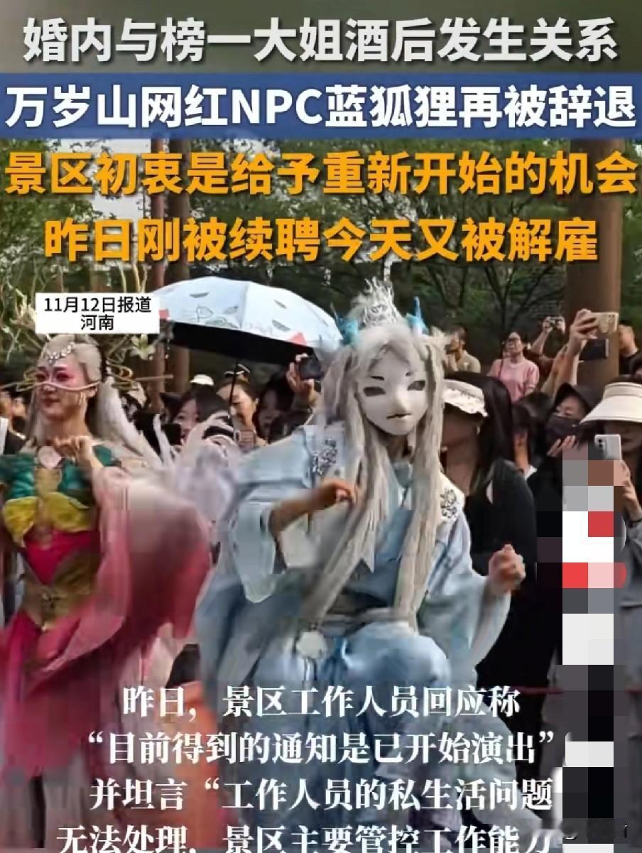 真是大快人心啊,婚内和榜一大姐酒后出轨被曝光后,这只“小狐狸”辞职又被续约,最后又被辞职,真是只倒霉的狐狸啊。 当初万岁山景区的NPC,一只戴着可爱面具的“蓝色狐狸”一夜之间爆火,无数人去景区打卡就为了一睹男狐狸的风采。 果不其然啊,狐狸飘了,无数女粉丝为之疯狂和动容,连狐狸都经不住诱惑,和直播间一位深爱他的榜一大姐,在她无数个嘉年华和无数个守护他的直播间里,沦陷了。 可惜狐狸早早就结婚,被爆出婚内出轨后,直接引起了广大网友的反感,在舆论的攻击下,狐狸主动辞职。 本以为隔了这么久,大家应该失忆了,狐狸打算重操旧业,可没想到这一届的网友,三观正直的很,根本不买账,结果刚续约还没正式开始上班,哦豁,狐狸又失业了。 (图片来自网络视频)