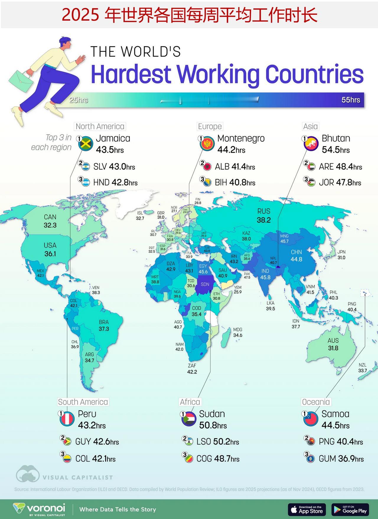 一图读懂2025 年世界各国每周平均工作时长 下面图表根据 2025 年各国每周平均工作时长对超过 150 个国家进行了排名。 全球平均每周工作时长约为 38.7 小时,而工作强度最大的国家与工作强度最小的国家之间的差异则接近 30 小时。 此图表所使用的数据来源于“世界人口评论”。该评论汇总了各国在正规和非正规劳动领域平均每周工作时长的估计数据。 ——不丹在工作时长方面位居全球之首 2025 年,不丹是世界上工作时间最长的国家,其员工平均每周工作时长为 54.5 小时。许多南亚和东南亚国家经济体工作时间也相当突出,其中阿联酋(48.4 小时)、巴基斯坦(47.5 小时)和印度(45.8 小时)。 在这些地区,延长工作时间往往与劳动密集型产业、较少的兼职岗位以及较薄弱的社会保障体系有关——这些因素导致了员工和个体经营者的工作时间都变得更长。 ——欧洲的短工时制度反映了发达经济体的特征 在另一端,西欧和北欧地区的每周工作时长仍处于有记录以来的最短水平。荷兰(26.8 小时)、挪威(27.1 小时)和丹麦(28.8 小时)的每周工作时长均低于 30 小时。 这些国家得益于强大的生产力、高度的自动化以及严格的劳动保护措施。平均工作时间较短的同时,往往伴随着更高的生活水平和更良好的工作与生活平衡。 ——美国工作时间处于中等水平 美国平均每周工作时长约为 36.1 小时,低于全球平均水平,但高于其他主要发达国家,如加拿大(32.3 小时)、英国(31.0 小时)和法国(30.8 小时)。 相比之下,新兴市场(尤其是非洲地区)的工作周时长却较为长,比如苏丹(50.8 小时)和莱索托(50.2 小时),在那里经济需求促使人们延长工作时间。