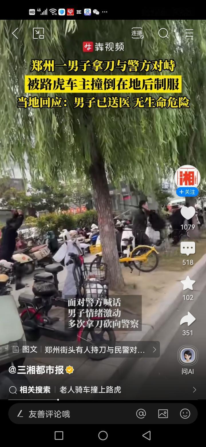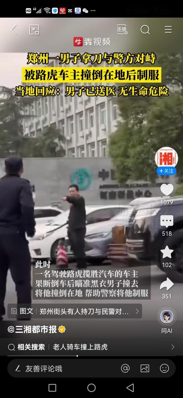 这事儿是11月12号发生的。有网友在网上发了个视频,说在河南郑州一个银行的培训中心门口,有个人拿着刀,跟警察僵持着。 后来,现场一个穿着便装的司机,开着一辆路虎越野车,一下子把那个拿刀的人给撞倒了。那人倒地以后,警察马上就上去把他给控制住了。这个事儿引起了好多人的关注。 到了第二天(13号),当地派出所的人回应说,当时确实有警察在现场处理这件事。另外,根据媒体的报道,警方说那个拿刀的人被撞了之后,人没事儿,没有生命危险。不过,具体是因为什么闹起来的,警方说不太方便透露。 说白了,就是这么个情况:一个歹徒持刀对峙警察,被一位路虎司机见义勇为给撞倒了,最后被警察抓了,人也没出大事。原因嘛,官方还没说。持刀事件 工商银行事件 河南街头事件
