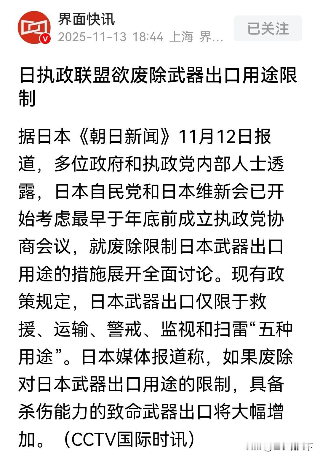 近日, 日本那俩个执政党(自民党和维新会),打算赶在年底前开个会,专门讨论要不要把武器出口的用途限制给废了! 以前日本卖武器,只能限定在救援、运输、警戒这些“非杀伤”的用途里,相当于给武器套了个“温柔壳”,不让它真的用来打人。但要是这次把限制给撤了,那可就不一样了,具备杀伤能力的致命武器,出口量指定得往上蹿。 毕竟以前日本在武器出口这块一直有“紧箍咒”,现在突然想松绑,不管是对地区安全还是国际武器贸易的节奏,都可能带来连锁反应。致命武器要是更容易往外流,那潜在的风险可不就跟着涨了? 这事儿可不小事,毕竟武器出口松绑,对周边安全和国际武器贸易都可能有连锁反应,后续有待观察! 日本战略改变