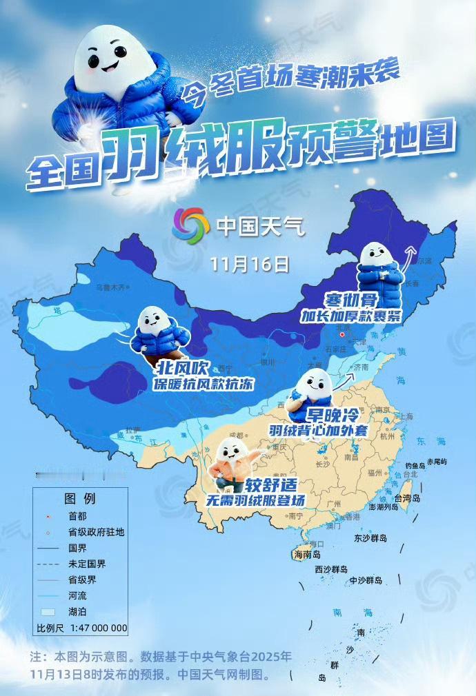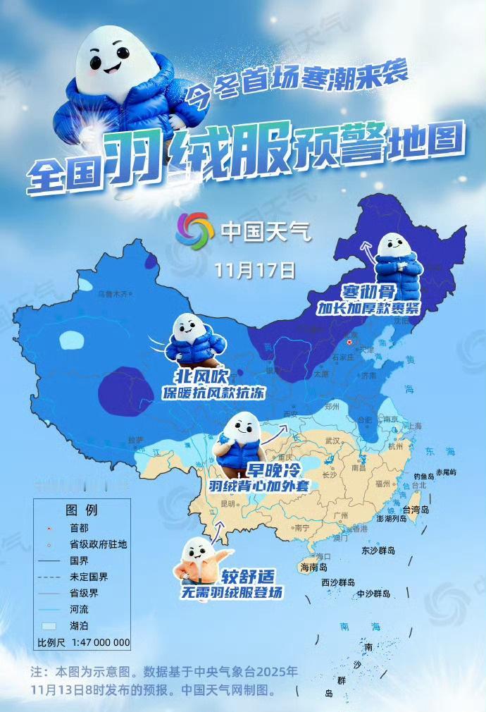 【2025全国羽绒服预警地图出炉】今冬首场寒潮将发货冷冷冷 今冬首场寒潮发货在即,11月14日至17日将横扫我国大江南北,部分地区累计降温幅度可超10℃,明起至下周初,我国中东部将开启一场大范围的气温跳水大赛,近30个省会、首府、直辖市气温将刷新今年下半年来新低,不少地区都需羽绒服护体。戳↓↓全国羽绒服预警地图,看你需要加长加厚款还是保暖抗风款。@中国天气
