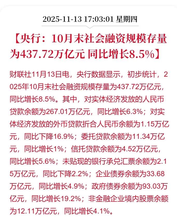 好消息来啦!!央行放大招! 金融数据超预期! 明天A股要起飞! 刚出炉的10月金融数据太炸了! 央行最新消息:社融存量437.72万亿,同比增8.5%;M2余额335.13万亿,同比涨8.2%;M1增6.2%,M0直接飙到10.6%! 这数据通俗说就是:市场上的钱超充裕! 当前GDP增速才5%左右,M2增速却超8%,流动性直接拉满! 更关键的是M1-M2剪刀差在缩小,意味着企业生意好转,大家敢花钱敢投资,经济妥妥在复苏! 对股民来说,这就是三重利好砸脸:流动性够、估值合理、消费还在回暖! 明天A股大概率是起飞节奏,股民朋友们赶紧坐稳扶好,可别错过这波行情!