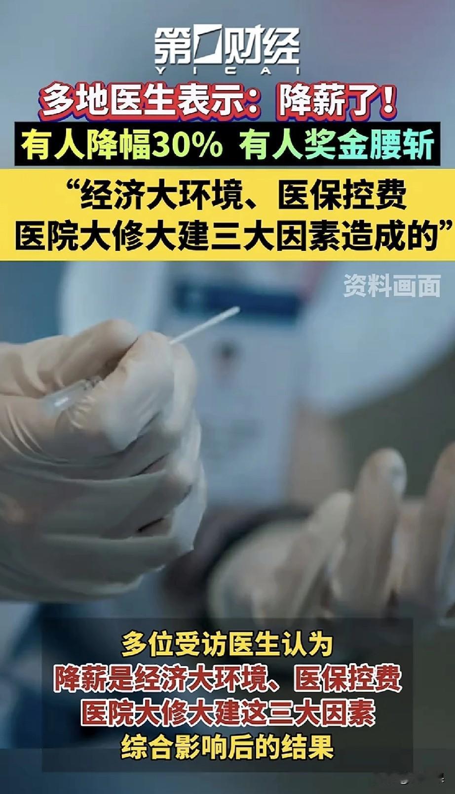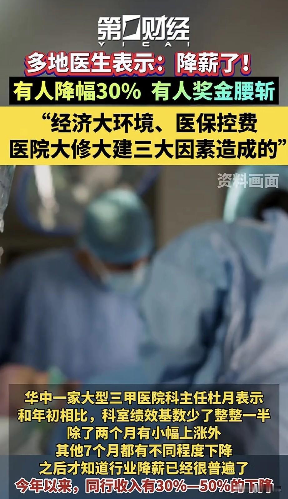 真没想到,医生也降薪了。 真想问问一位医生的同学,但又怕伤了人家的自尊。 他和他媳妇曾经在同学圈里工资最高,当然除了做生意的。 他们有两个孩子,家里都是农村的,父母都是农民。 看报道是确实降了,原因无外乎也是大环境不好。 前段跟孩子谈高考志愿目标,说当个医生也不错,虽然成才周期长些,可越老越吃香啊。 不过也很卷,想进好医院当个好医生,起码得博士毕业,甚至得有海外进修经验。 医生也很辛苦,天天跟病人打交道。都说医者仁心,但愿降薪不要影响了他们的心情。