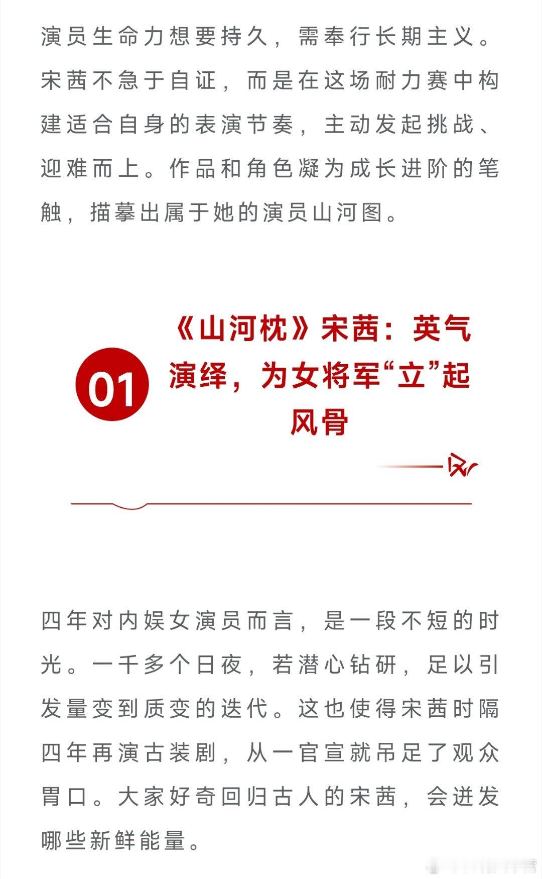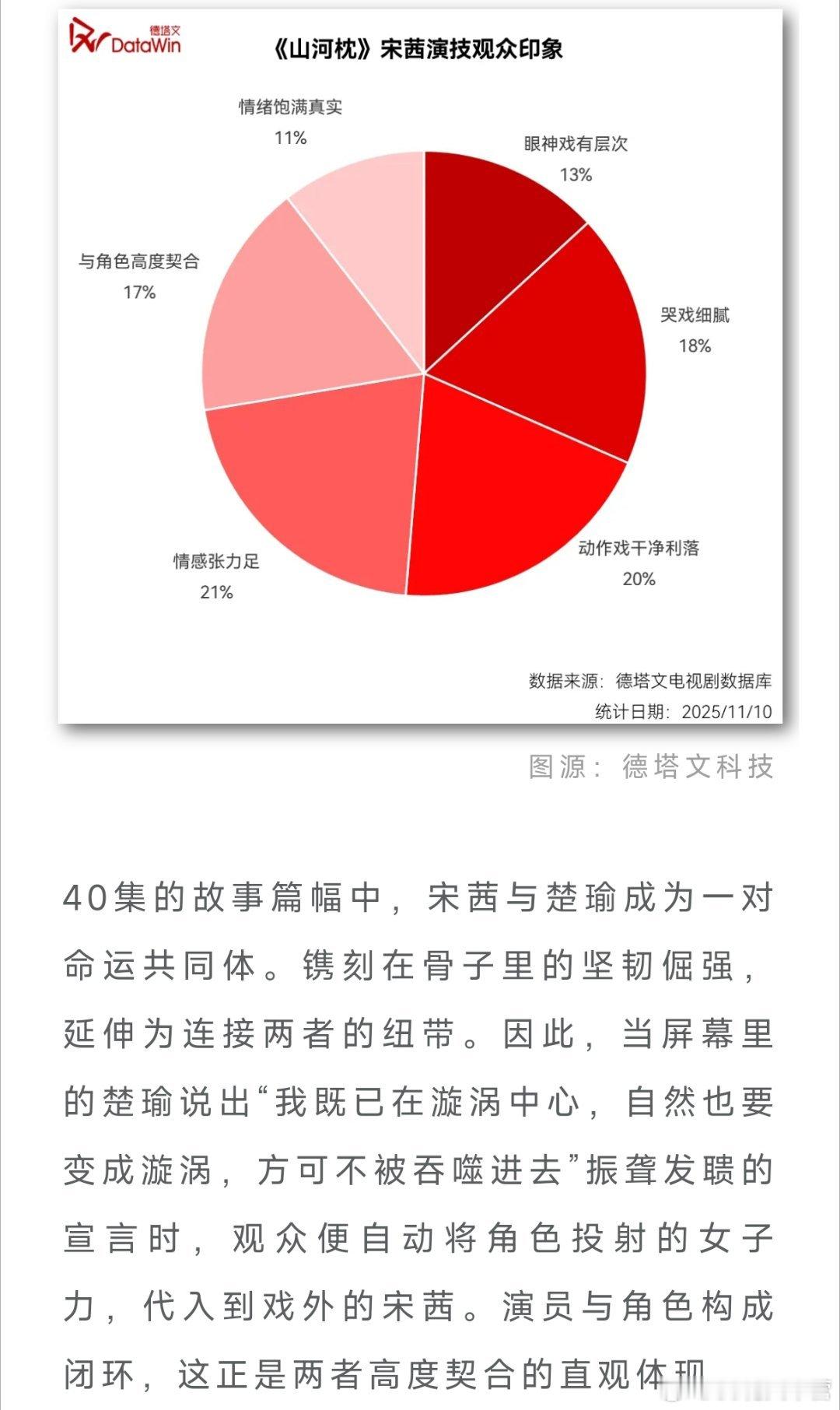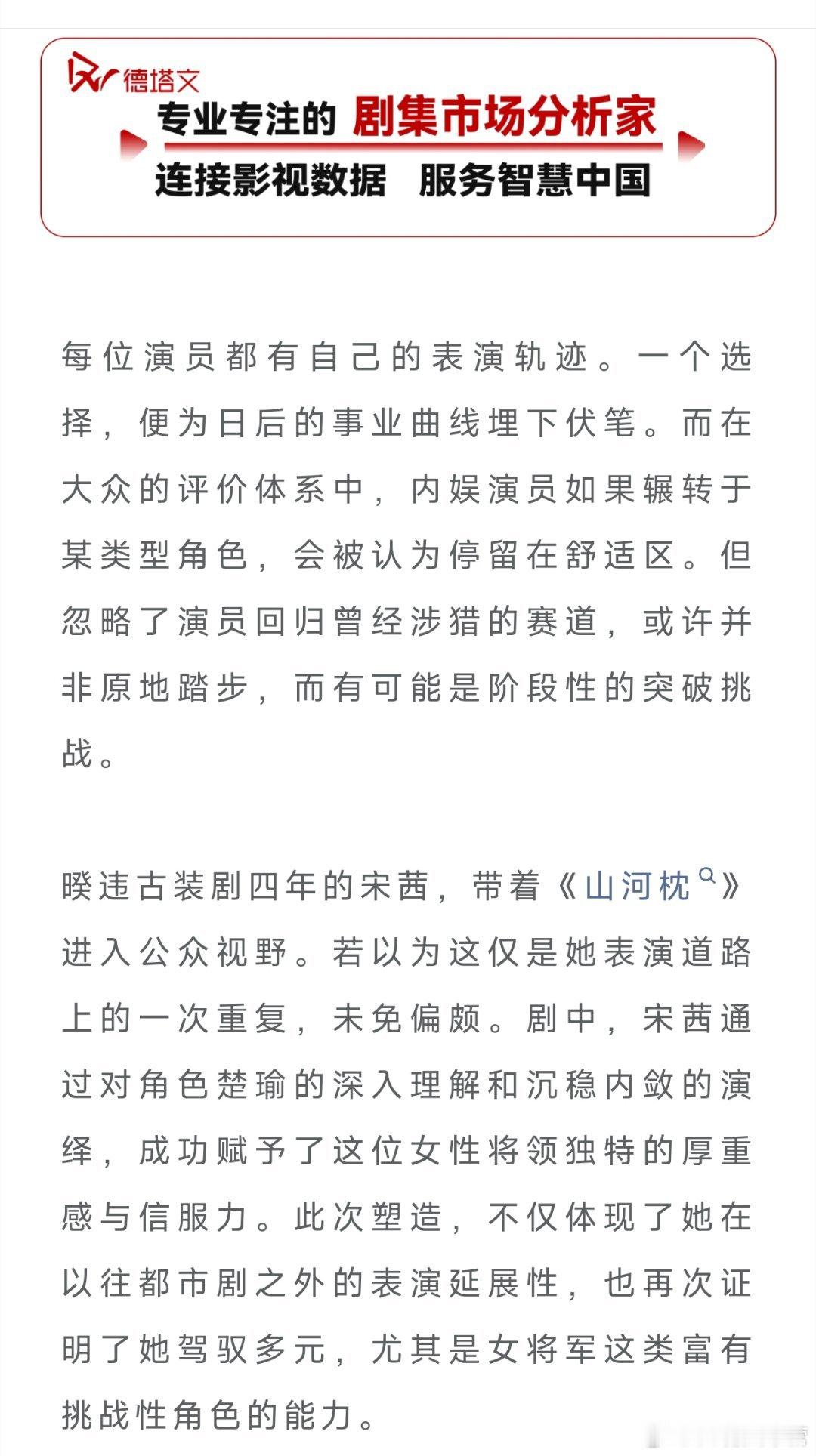 德塔文长文评价演员宋茜——回归与挑战,描绘演员“山河”徳塔文监测到的宋茜演技观众印象:契合角色、情感张力足、打戏干净利落、哭戏细腻,说明她跟楚瑜形神兼备,用文可打动人心、武能酣畅淋漓的演技获得了观众认可。主动探索、积累口碑、成熟蜕变、收获主流认可,这些关键词串联起宋茜的演员之路。她也完成了作品题材、角色类型、演技广深度三方面的突破,在表演疆域站稳脚跟。凭借《山河枕》,宋茜完成了当下表演道路上的一次回归与挑战。不仅是她在古装题材沉淀四年后的“成果汇报”,还是在都市剧“舒适区”之外、主动寻求突破的“演员自觉”行为。宋茜给自己设下一道道关卡,在打怪升级的表演征途上蜕变,为“演员”二字的分量加码。