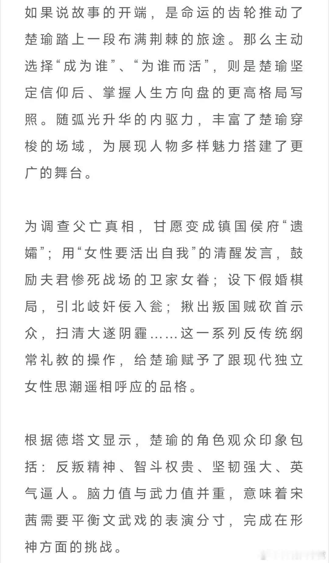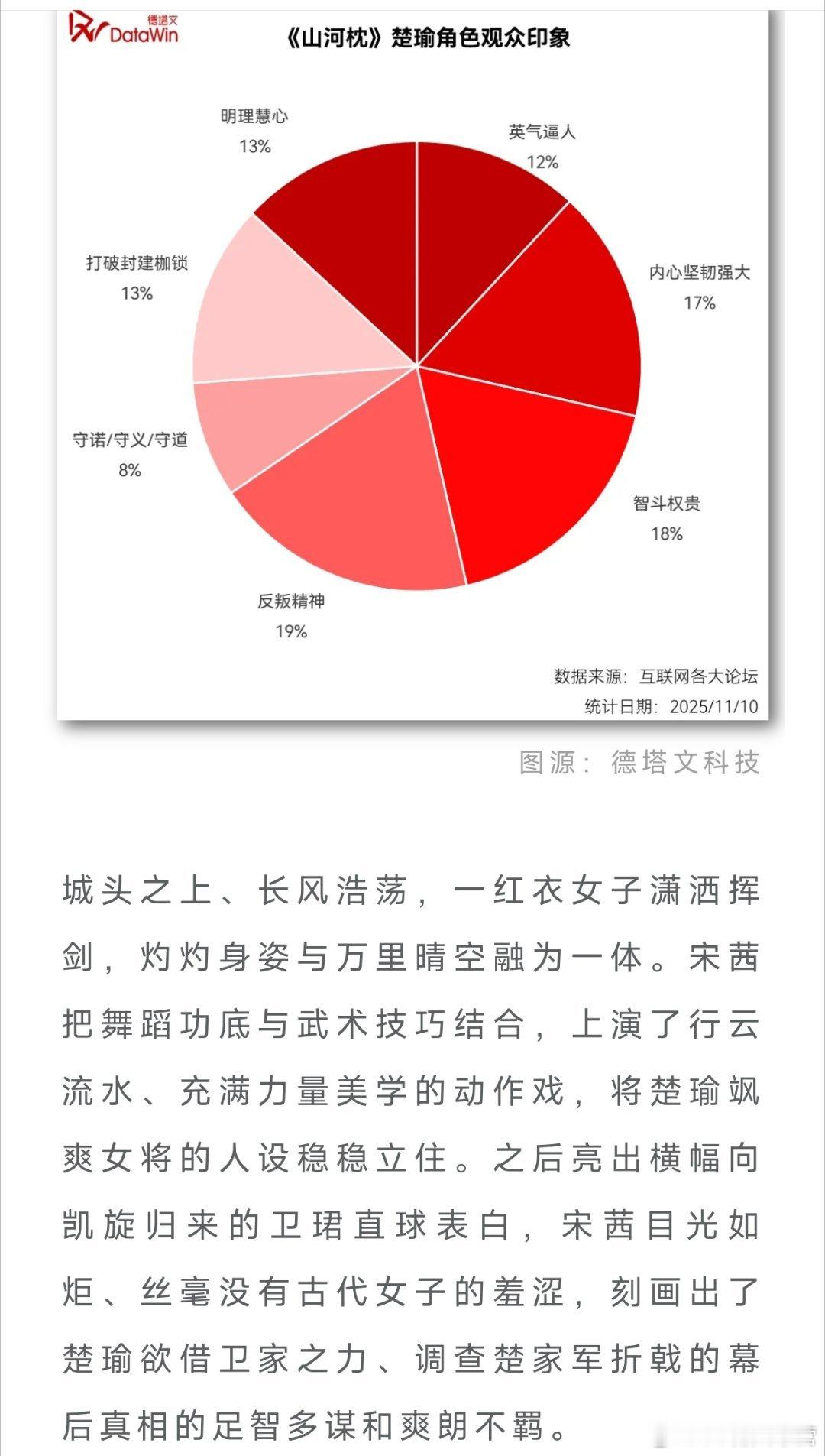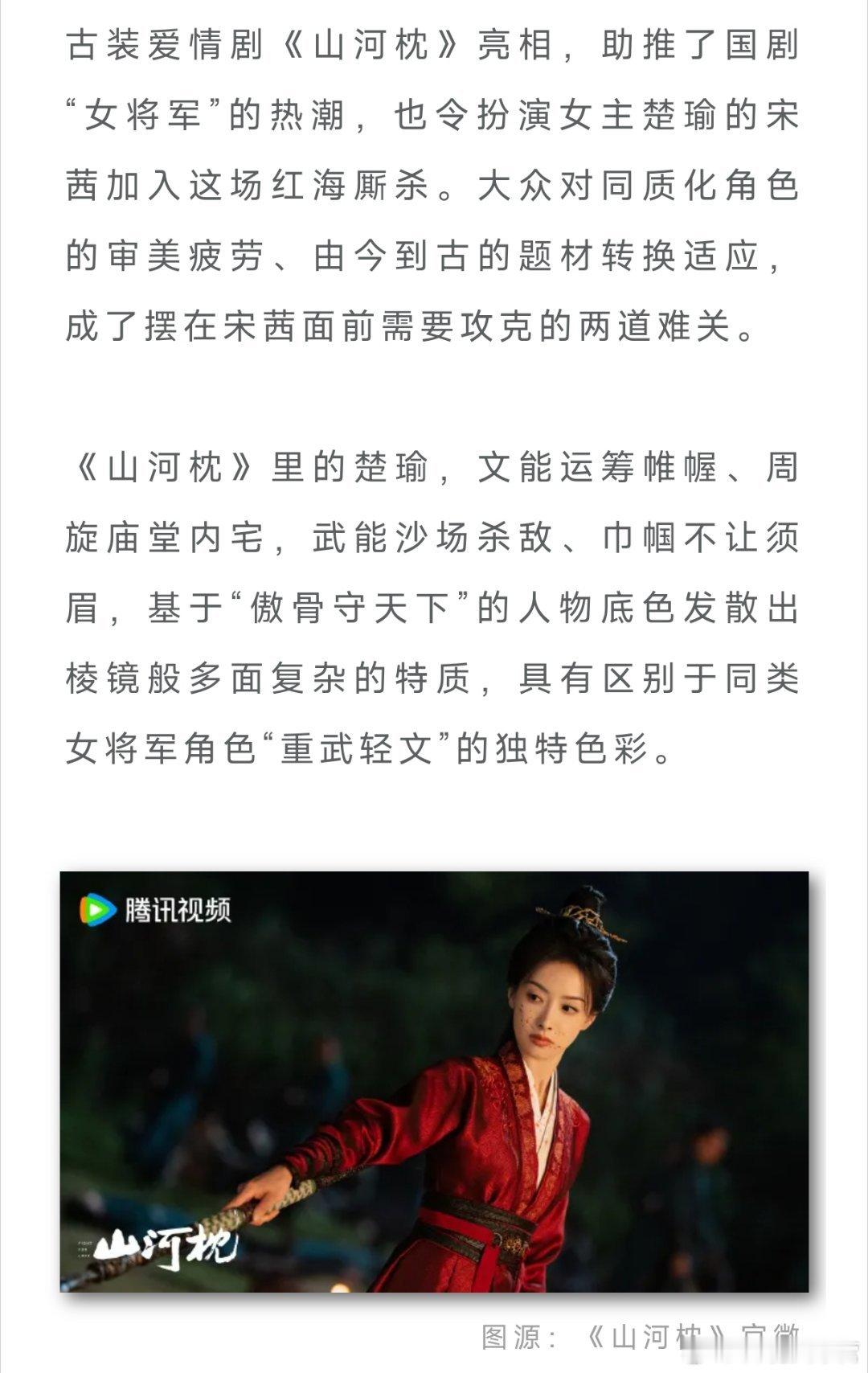 德塔文长文评价演员宋茜——回归与挑战,描绘演员“山河”徳塔文监测到的宋茜演技观众印象:契合角色、情感张力足、打戏干净利落、哭戏细腻,说明她跟楚瑜形神兼备,用文可打动人心、武能酣畅淋漓的演技获得了观众认可。主动探索、积累口碑、成熟蜕变、收获主流认可,这些关键词串联起宋茜的演员之路。她也完成了作品题材、角色类型、演技广深度三方面的突破,在表演疆域站稳脚跟。凭借《山河枕》,宋茜完成了当下表演道路上的一次回归与挑战。不仅是她在古装题材沉淀四年后的“成果汇报”,还是在都市剧“舒适区”之外、主动寻求突破的“演员自觉”行为。宋茜给自己设下一道道关卡,在打怪升级的表演征途上蜕变,为“演员”二字的分量加码。